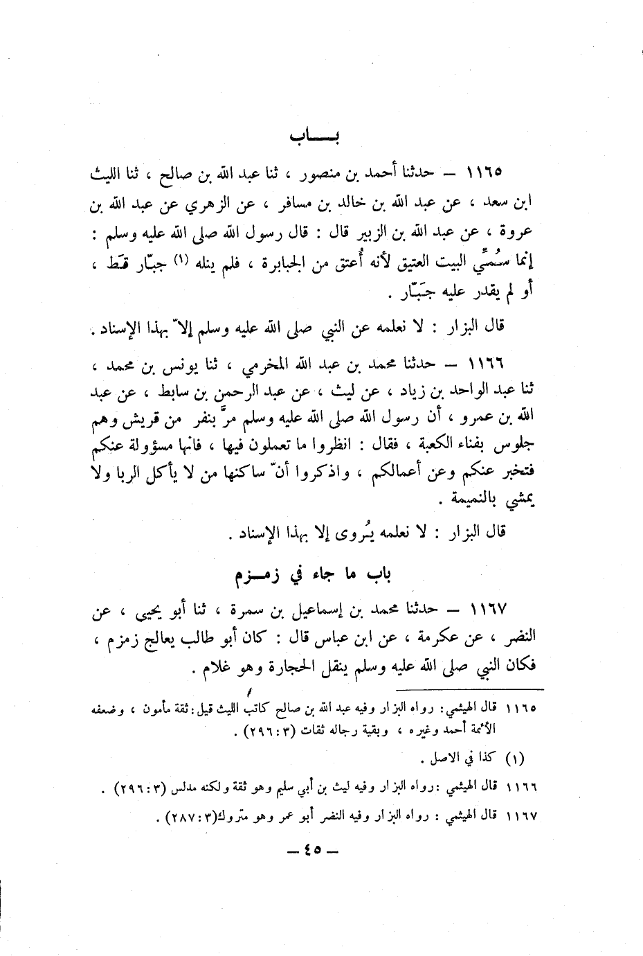 1167 - حَدَّثَنَا مُحَمَّدُ بْنُ إِسْمَاعِيلَ بْن سَمُرَة، ثنا أَبُو يَحْيَى، عَنِ النَّضْرِ، عَنْ عِكْرِمَةَ، عَنِ ابْنِ عَبَّاسٍ، قَالَ: كَانَ أَبُو طَالِبٍ يُعَالِجُ زَمْزَمَ، فَكَانَ النَّبِيُّ صَلَّى اللَّهُ عَلَيْهِ وَسَلَّمَ يَنْقُلُ الْحِجَارَةَ وَهُوَ غُلامٌ.