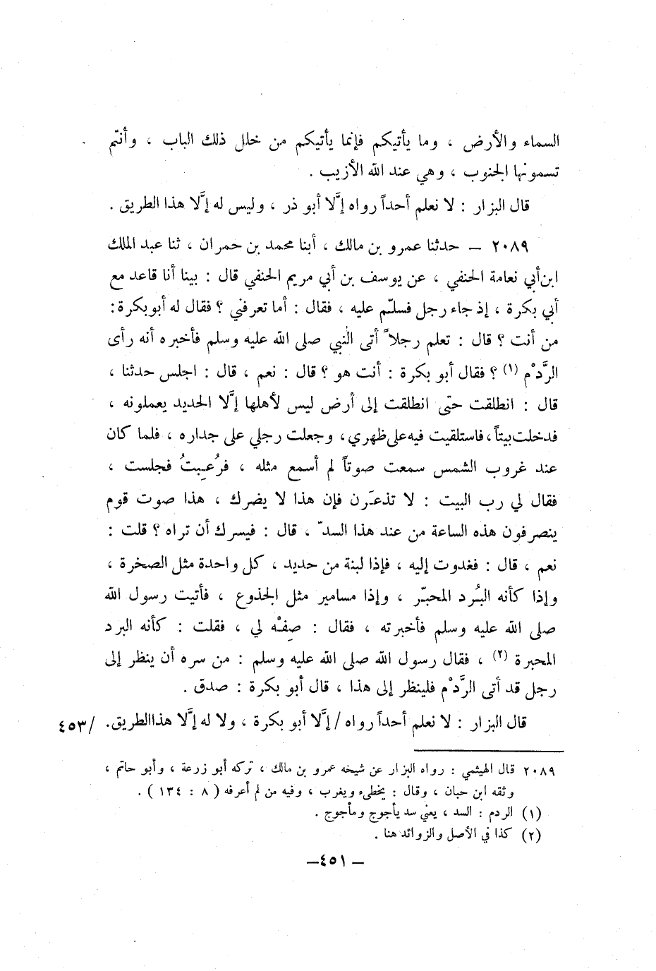 2089 - حَدَّثَنَا عَمْرُو بْنُ مَالِكٍ، أبنا مُحَمَّدُ بْنُ حُمْرَانَ، ثنا عَبْدُ الْمَلِكِ ابْنُ أَبِي نَعَامَةَ الْحَنَفِيُّ، عَنْ يُوسُف بْنِ أَبِي مَرْيَمَ الْحَنَفِيِّ، قَالَ: بَيْنَا أَنَا قَاعِدٌ مَعَ أَبِي بَكْرَةَ، إِذْ جَاءَ رَجُلٌ فَسَلَّمَ عَلَيْهِ، فَقَالَ: أَمَا تَعْرِفُنِي؟ فَقَالَ لَهُ أَبُو بَكْرَةَ: مَنْ أَنْتَ؟ قَالَ: تَعْلَمُ رَجُلا أَتَى النَّبِيَّ صَلَّى اللَّهُ عَلَيْهِ وَسَلَّمَ فَأَخْبَرَهُ أَنَّهُ رَأَى الرَّدْمَ؟ فَقَالَ أَبُو بَكْرَةَ: أَنْتَ هُوَ؟ قَالَ: نَعَمْ، قَالَ: اجْلِسْ حَدِّثْنَا، قَالَ: انْطَلَقْتُ حَتَّى انْطَلَقْتُ إِلَى أَرْضٍ لَيْسَ لأَهْلِهَا إِلا الْحَدِيدُ يَعْمَلُونَهُ، فَدَخَلْتُ بَيْتًا، فَاسْتَلْقَيْتُ فِيهِ عَلَى ظَهْرِي، وَجَعَلْتُ رِجْلِي عَلَى جِدَارِهِ، فَلَمَّا كَانَ عِنْدَ غُرُوبِ الشَّمْسِ سَمِعْتُ صَوْتًا لَمْ أَسْمَعْ مِثْلَهُ، فَرُعِبْتُ فَجَلَسْتُ، فَقَالَ لِي رَبُّ الْبَيْتِ: لا تَذْعَرَنَّ فَإِنَّ هَذَا لا يَضُرُّكَ، هَذَا صَوْتُ قَوْمٍ يَنْصَرِفُونَ هَذِهِ السَّاعَةَ مِنْ عِنْدِ هَذَا السَّدِّ، قَالَ: فَيَسُرُّكَ أَنْ تَرَاهُ؟ قُلْتُ: نَعَمْ، قَالَ: فَغَدَوْتُ إِلَيْهِ، فَإِذَا لَبِنَةٌ مِنْ حَدِيدٍ، كُلُّ وَاحِدَةٍ مِثْلُ الصَّخْرَةِ، وَإِذَا كَأَنَّهُ الْبُرْدُ الْمُحَبَّرُ، وَإِذَا مَسَامِيرُ مِثْلُ الْجُذُوعِ، فَأَتَيْتُ رَسُولَ اللَّهِ صَلَّى اللَّهُ عَلَيْهِ وَسَلَّمَ فَأَخْبَرْتُهُ، فَقَالَ: «صِفْهُ لِي» ، فَقُلْتُ: كَأَنَّهُ الْبُرْدُ الْمُحَبَّرَةُ، فَقَالَ رَسُولُ اللَّهِ صَلَّى اللَّهُ عَلَيْهِ وَسَلَّمَ: «مَنْ سَرَّهُ أَنْ يَنْظُرَ إِلَى رَجُلٍ قَدْ أَتَى الرَّدْمَ فَلْيَنْظُرْ إِلَى هَذَا» ، قَالَ أَبُو بَكْرَةَ: صَدَقَ.