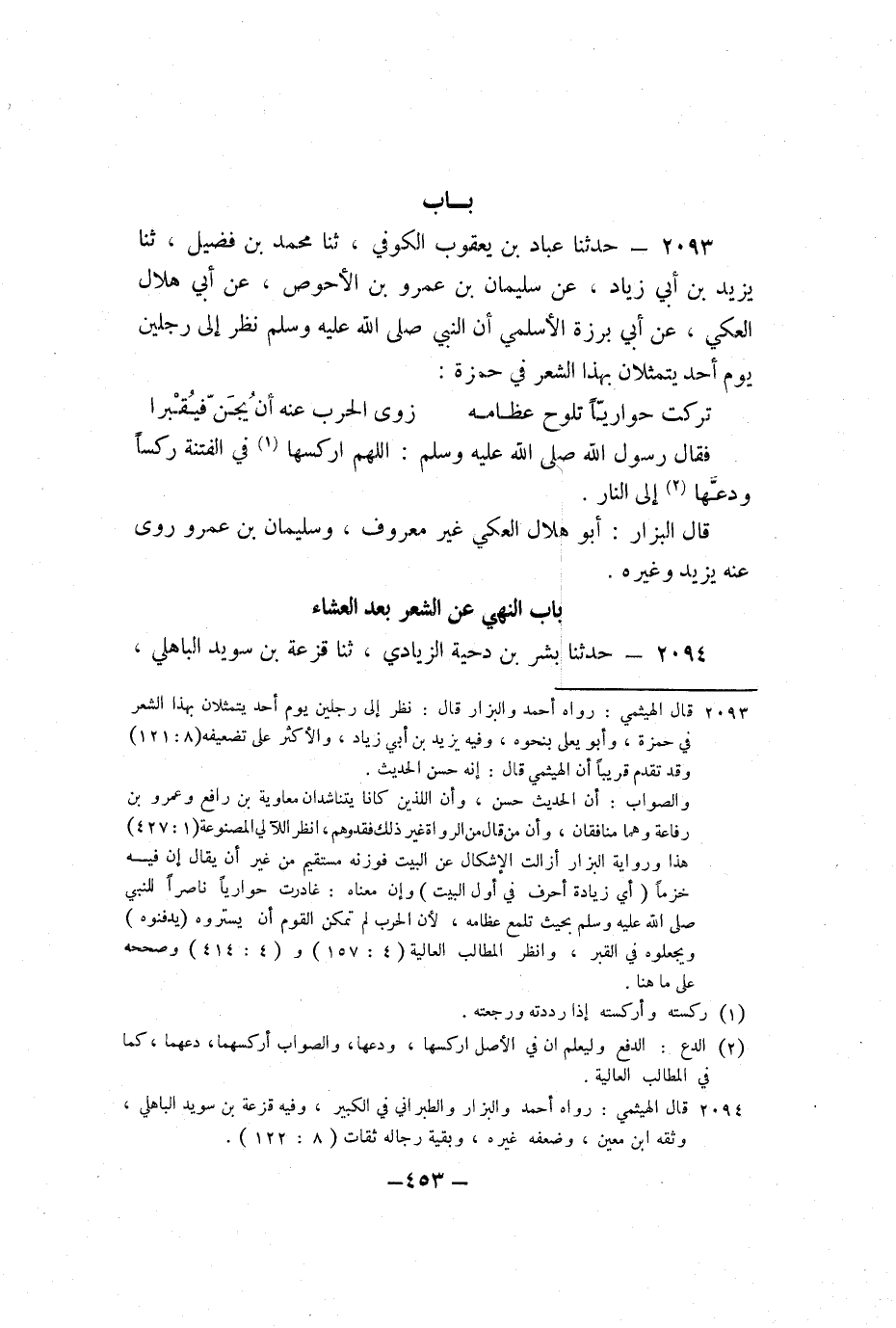 2093 - حَدَّثَنَا عَبَّادُ بْنُ يَعْقُوبَ الْكُوفِيُّ، ثنا مُحَمَّدُ بْنُ فُضَيْلٍ، ثنا يَزِيدُ بْنُ أَبِي زِيَادٍ، عَنْ سُلَيْمَانَ بْنِ عَمْرِو بْنِ الأَحْوَصِ، عَنْ أَبِي هِلالٍ الْعَكِّيِّ، عَنْ أَبِي بَرْزَةَ الأَسْلَمِيِّ، أَنَّ النَّبِيَّ صَلَّى اللَّهُ عَلَيْهِ وَسَلَّمَ نَظَرَ إِلَى رَجُلَيْنِ يَوْمَ أُحُدٍ يَتَمَثَّلانِ بِهَذَا الشِّعْرِ فِي حَمْزَةَ: