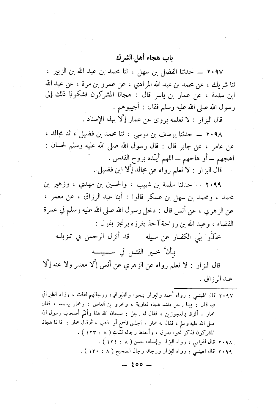 2097 - حَدَّثَنَا الْفَضْلُ بْنُ سَهْلٍ، ثنا مُحَمَّدُ بْنُ عَبْدِ اللَّهِ بْن الزُّبَيْرِ، ثنا شَرِيكٌ، عَنْ مُحَمَّدِ بْنِ عَبْدِ اللَّهِ الْمُرَادِيِّ، عَنْ عَمْرِو بْنِ مُرَّةَ، عَنْ عَبْدِ اللَّهِ بْنِ سَلَمَةَ، عَنْ عَمَّارِ بْنِ يَاسِرٍ، قَالَ: هَجَانَا الْمُشْرِكُونَ فَشَكَوْنَا ذَلِكَ إِلَى رَسُولِ اللَّهِ صَلَّى اللَّهُ عَلَيْهِ وَسَلَّمَ فَقَالَ: «أَجِيبُوهُمْ» .