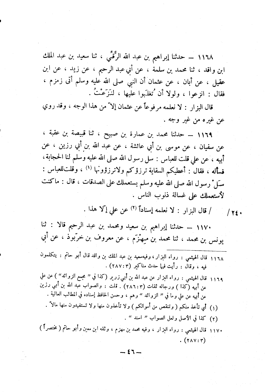 1168 - حَدَّثَنَا إِبْرَاهِيمُ بْنُ عَبْدِ اللَّهِ الرَّقِّيُّ، ثنا سَعِيدُ بْنُ عَبْدِ الْمَلِكِ بْنِ وَاقِدٍ، ثنا مُحَمَّدُ بْنُ سَلَمَةَ، عَنْ أَبِي عَبْدِ الرَّحِيمِ، عَنْ زَيْدٍ، عَنِ ابْنِ عُقَيْلٍ، عَنْ أَبَانٍ، عَنْ عُثْمَانَ، أَنَّ النَّبِيَّ صَلَّى اللَّهُ عَلَيْهِ وَسَلَّمَ أَتَى زَمْزَمَ، فَقَالَ: انْزِعُوا، وَلَوْلا أَنْ تُغْلَبُوا عَلَيْهَا، لَنُزِعَتْ.