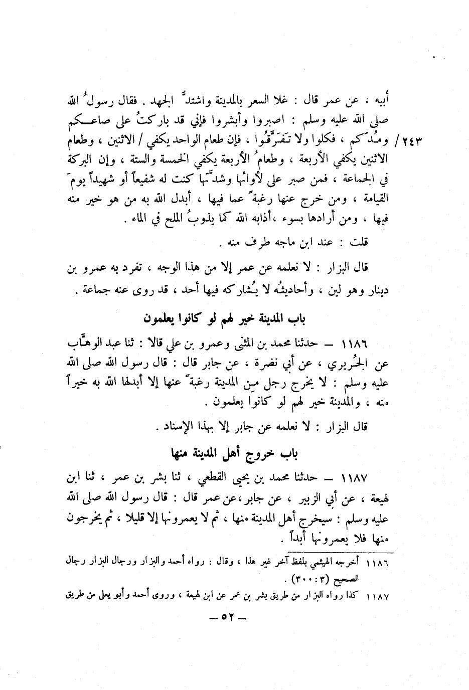 1186 - حَدَّثَنَا مُحَمَّدُ بْنُ الْمُثَنَّى، وَعَمْرُو بْنُ عَلِيٍّ، قَالا: ثنا عَبْدُ الْوَهَّابِ، عَنِ الْجُرَيْرِيِّ، عَنْ أَبِي نَضْرَةَ، عَنْ جَابِرٍ، قَالَ: قَالَ رَسُولُ اللَّهِ صَلَّى اللَّهُ عَلَيْهِ وَسَلَّمَ: «لا يَخْرُجُ رَجُلٌ مِنَ الْمَدِينَةِ رَغْبَةً عَنْهَا إِلا أَبْدَلَهَا اللَّهُ بِهِ خَيْرًا مِنْهُ، وَالْمَدِينَةُ خَيْرٌ لَهُمْ لَوْ كَانُوا يَعْلَمُونَ» .