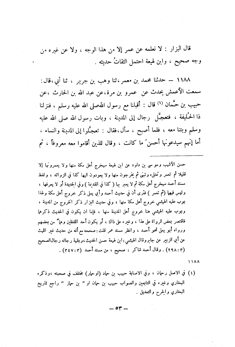 1188 - حَدَّثَنَا مُحَمَّدُ بْنُ مَعْمَرٍ، ثنا وَهْبُ بْنُ جَرِيرٍ، ثنا أَبِي، قَالَ: سَمِعْتُ الأَعْمَشَ يُحَدِّثُ، عَنْ عَمْرِو بْنِ مُرَّةَ، عَنْ عَبْدِ اللَّهِ بْنِ الْحَارِثِ، عَنْ حَبِيبِ بْنِ حِمَّانَ، قَالَ: أَقْبَلْنَا مَعَ رَسُولِ اللَّهِ صَلَّى اللَّهُ عَلَيْهِ وَسَلَّمَ، فَنَزَلْنَا ذَا الْحُلَيْفَةِ، فَتَعَجَّلَ رِجَالٌ إِلَى الْمَدِينَةِ، وَبَاتَ رَسُولُ اللَّهِ صَلَّى اللَّهُ عَلَيْهِ وَسَلَّمَ وَبِتْنَا مَعَهُ، فَلَمَّا أَصْبَحَ، سَأَلَ، فَقَالَ: «تَعَجَّلُوا إِلَى الْمَدِينَةِ وَالنِّسَاءِ، أَمَا إِنَّهُمْ سَيَدَعُونَهَا أَحْسَنَ مَا كَانَتْ» ، وَقَالَ لِلَّذِينَ أَقَامُوا مَعَهُ مَعْرُوفًا، ثُمَّ