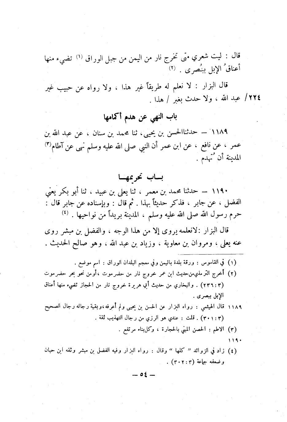 قَالَ: «لَيْتَ شِعْرِي مَتَى تَخْرُجُ نَارٌ مِنَ الْيَمَنِ مِنْ جَبَلِ الْوَرَّاقِ تُضِيءُ مِنْهَا أَعْنَاقُ الإِبِلِ بِبُصْرَى» .