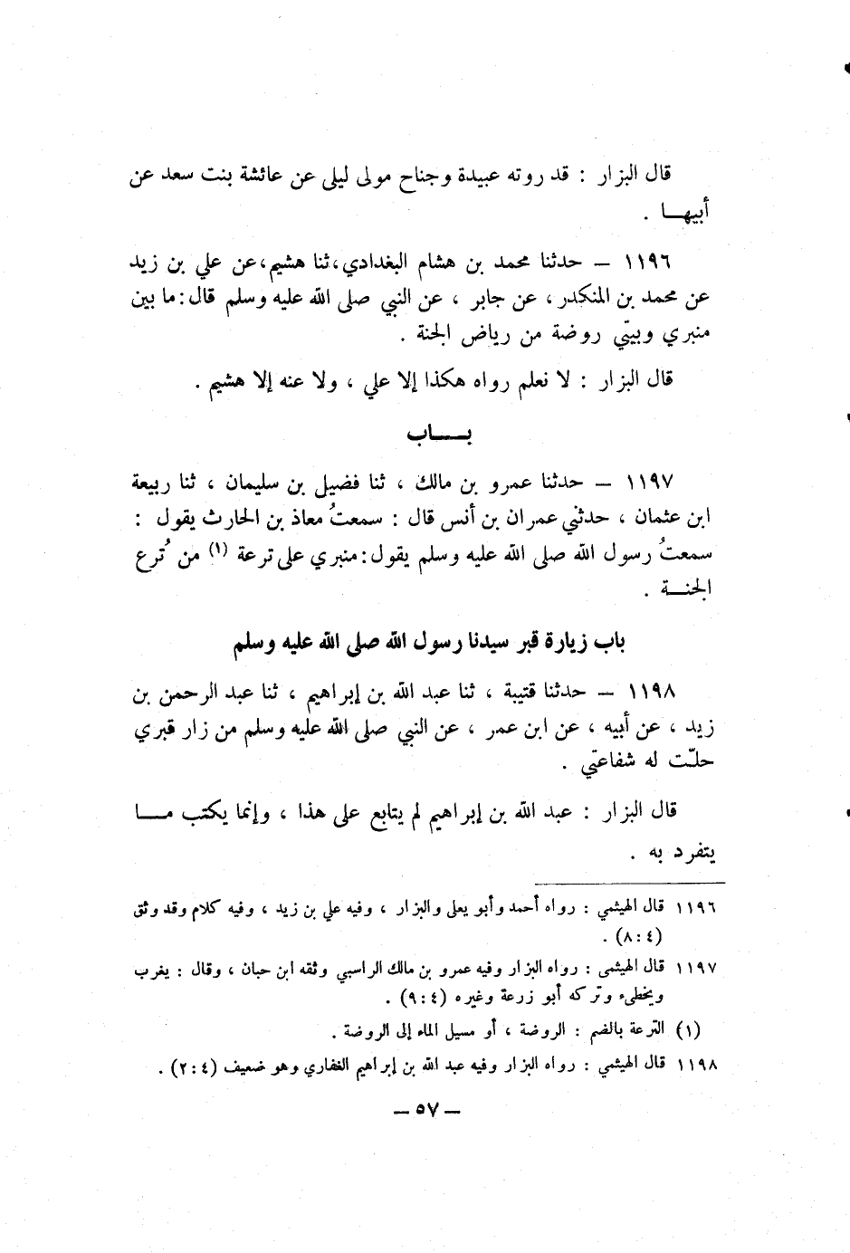 1198 - حَدَّثَنَا قُتَيْبَةُ، ثنا عَبْدُ اللَّهِ بْنُ إِبْرَاهِيمَ، ثنا عَبْدُ الرَّحْمَنِ بْنُ زَيْدٍ، عَنْ أَبِيهِ، عَنِ ابْنِ عُمَرَ، عَنِ النَّبِيِّ صَلَّى اللَّهُ عَلَيْهِ وَسَلَّمَ: «مَنْ زَارَ قَبْرِي حَلَّتْ لَهُ شَفَاعَتِي» .