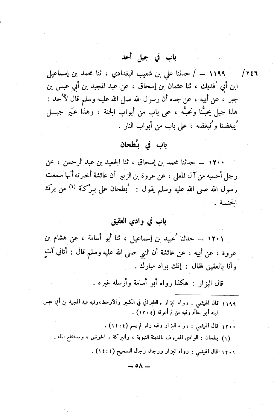 1199 - حَدَّثَنَا عَلِيُّ بْنُ شُعَيْبٍ الْبَغْدَادِيُّ، ثنا مُحَمَّدُ بْنُ إِسْمَاعِيلَ ابْن أَبِي فُدَيْكٍ، ثنا عُثْمَانُ بْنُ إِسْحَاقَ، عَنْ عَبْدِ الْمَجِيدِ بْنِ أَبِي عَبْسِ بْنِ جَبْرٍ، عَنْ أَبِيهِ، عَنْ جَدِّهِ، أَنَّ رَسُولَ اللَّهِ صَلَّى اللَّهُ عَلَيْهِ وَسَلَّمَ قَالَ لأُحُدٍ: «هَذَا جَبَلٌ يُحِبُّنَا وَنُحِبُّهُ، عَلَى بَابٍ مِنْ أَبْوَابِ الْجَنَّةِ، وَهَذَا عَيْرٌ جَبَلٌ يُبْغِضُنَا وَنُبْغِضُهُ، عَلَى بَابٍ مِنْ أَبْوَابِ النَّارِ» .