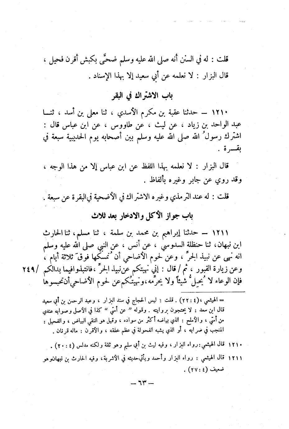 1210 - حَدَّثَنَا عُقْبَةُ بْنُ مُكْرَمٍ الأَسَدِيُّ، ثنا مُعَلَّى بْنُ أَسَدٍ، ثنا عَبْدُ الْوَاحِدِ بْنُ زِيَادٍ، عَنْ لَيْثٍ، عَنْ طَاوُسٍ، عَنِ ابْنِ عَبَّاسٍ، قَالَ: اشْتَرَكَ رَسُولُ اللَّهِ صَلَّى اللَّهُ عَلَيْهِ وَسَلَّمَ بَيْنَ أَصْحَابِهِ يَوْمَ الْحُدَيْبِيَةِ سَبْعَةً فِي بَقَرَةٍ.