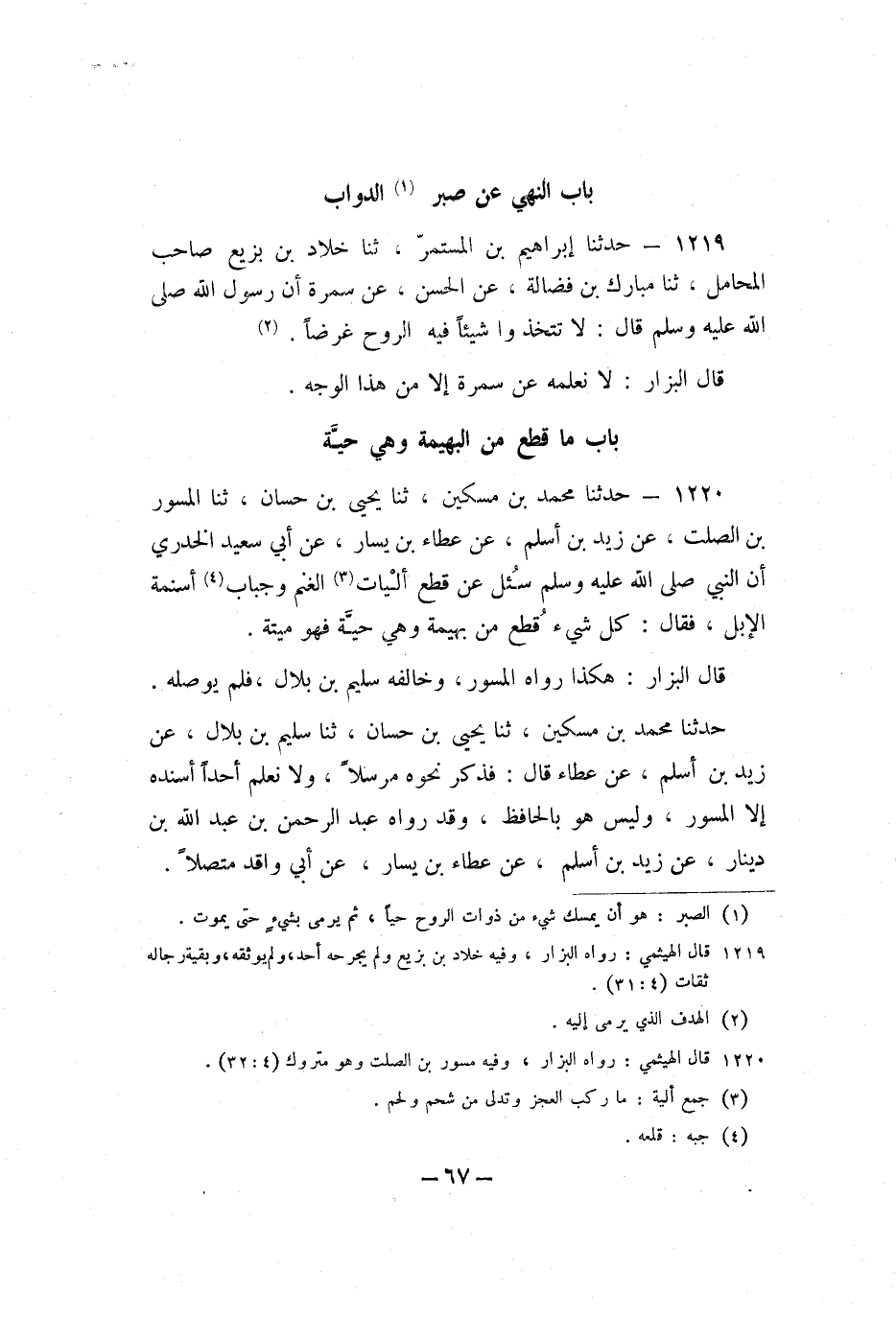 1220 - حَدَّثَنَا مُحَمَّدُ بْنُ مِسْكِينٍ، ثنا يَحْيَى بْنُ حَسَّانٍ، ثنا الْمِسْوَرُ بْنُ الصَّلْتِ، عَنْ زَيْدِ بْنِ أَسْلَمَ، عَنْ عَطَاءِ بْنِ يَسَارٍ، عَنْ أَبِي سَعِيدٍ الْخُدْرِيِّ، أَنَّ النَّبِيَّ صَلَّى اللَّهُ عَلَيْهِ وَسَلَّمَ سُئِلَ عَنْ قَطْعِ أَلْيَاتِ الْغَنَمِ وَجُبَابِ أَسْنِمَةِ الإِبِلِ، فَقَالَ: «كُلُّ شَيْءٍ قُطِعَ مِنْ بَهِيمَةٍ وَهِيَ حَيَّةٌ فَهُوَ مَيْتَةٌ» .