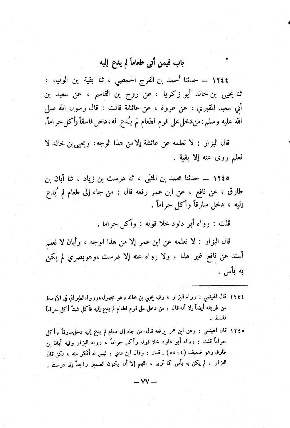 1244 - حَدَّثَنَا أَحْمَدُ بْنُ الْفَرَجِ الْحِمْصِيُّ، ثنا بَقِيَّةُ بْنُ الْوَلِيدِ، ثنا يَحْيَى بْنُ خَالِدٍ أَبُو زَكَرِيَّا، عَنْ رَوْحِ بْنِ الْقَاسِمِ، عَنْ سَعِيدِ بْنِ أَبِي سَعِيدٍ الْمَقْبُرِيِّ، عَنْ عُرْوَةَ، عَنْ عَائِشَةَ، قَالَتْ: قَالَ رَسُولُ اللَّهِ صَلَّى اللَّهُ عَلَيْهِ وَسَلَّمَ: «مَنْ دَخَلَ عَلَى قَوْمٍ لِطَعَامٍ لَمْ يُدْعَ لَهُ، دَخَلَ فَاسِقًا وَأَكَلَ حَرَامًا» .