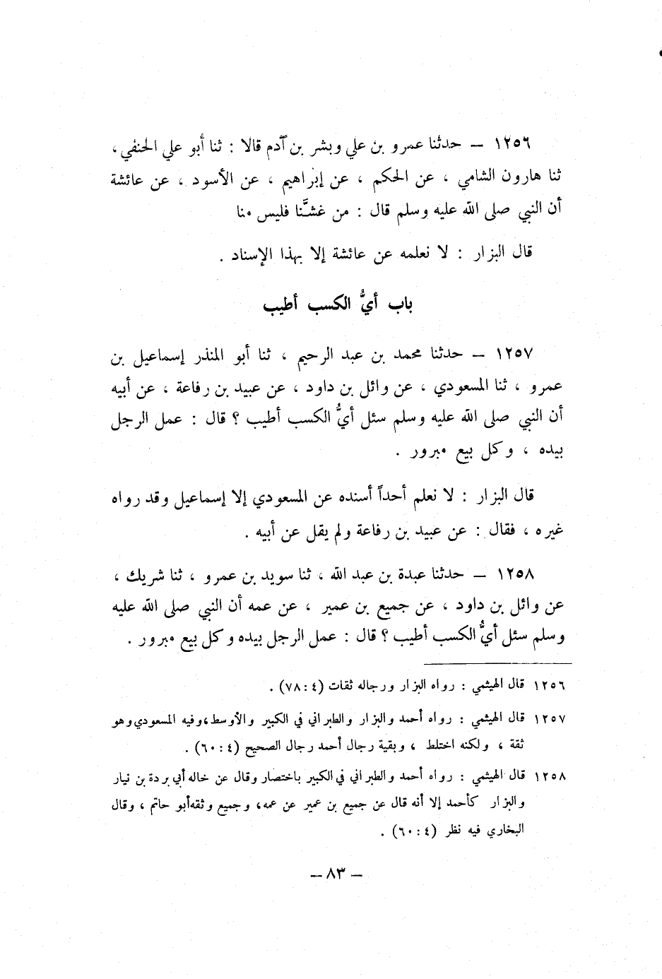 1257 - حَدَّثَنَا مُحَمَّدُ بْنُ عَبْدِ الرَّحِيمِ، ثنا أَبُو الْمُنْذِرِ إِسْمَاعِيلُ بْنُ عَمْرٍو، ثنا الْمَسْعُودِيُّ، عَنْ وَائِلِ بْنِ دَاوُدَ، عَنْ عُبَيْدِ بْنِ رِفَاعَةَ، عَنْ أَبِيهِ، أَنَّ النَّبِيَّ صَلَّى اللَّهُ عَلَيْهِ وَسَلَّمَ سُئِلَ: أَيُّ الْكَسْبِ أَطْيَبُ؟ قَالَ: «عَمَلُ الرَّجُلِ بِيَدِهِ، وَكُلُّ بَيْعٍ مَبْرُورٍ» .
