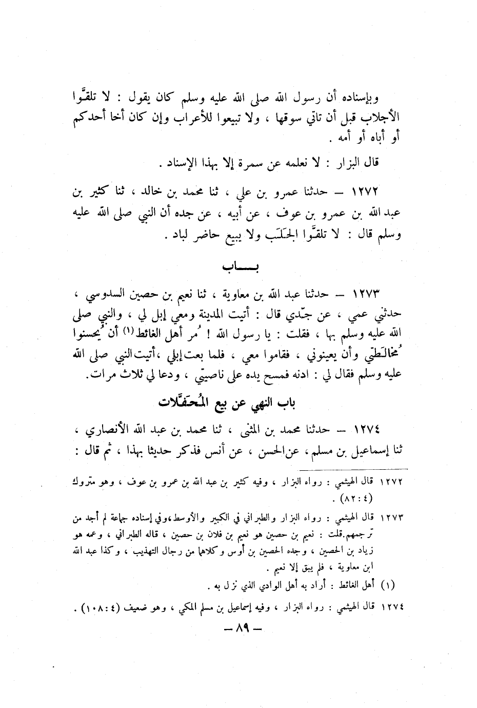 1272 - حَدَّثَنَا عَمْرُو بْنُ عَلِيٍّ، ثنا مُحَمَّدُ بْنُ خَالِدٍ، ثنا كَثِيرُ بْنُ عَبْدِ اللَّهِ بْنِ عَمْرِو بْنِ عَوْفٍ، عَنْ أَبِيهِ، عَنْ جَدِّهِ، أَنَّ النَّبِيَّ صَلَّى اللَّهُ عَلَيْهِ وَسَلَّمَ، قَالَ: «لا تَلَقَّوُا الْجَلَبَ وَلا يَبِيعُ حَاضِرٌ لِبَادٍ» .