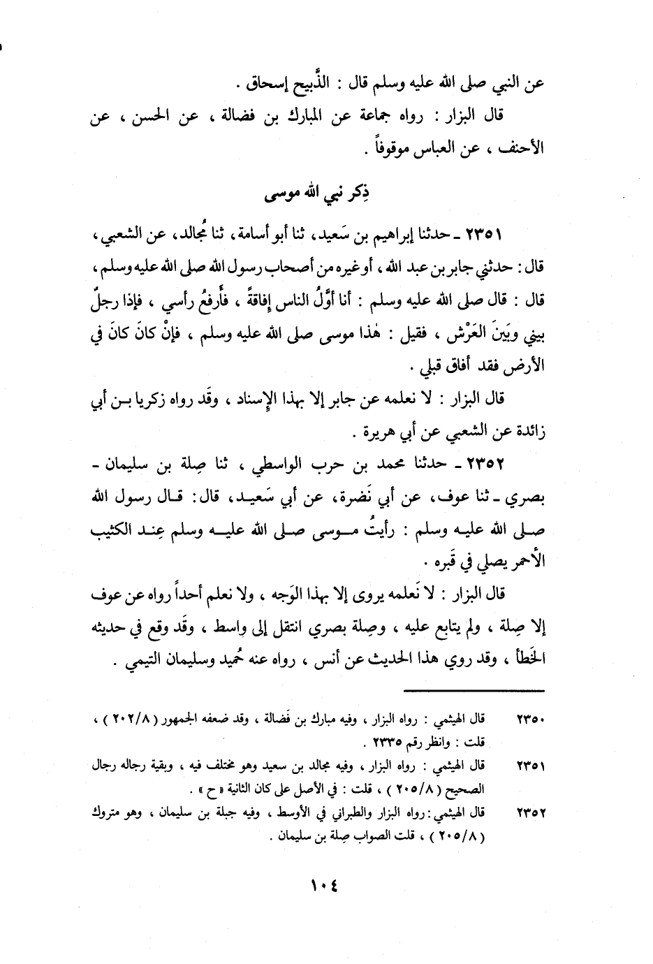2352 - حَدَّثَنَا مُحَمَّدُ بْنُ حَرْبٍ الْوَاسِطِيُّ، ثنا صِلَةُ بْنُ سُلَيْمَانَ - بَصْرِيٌّ - ثنا عَوْفٌ، عَنْ أَبِي نَضْرَةَ، عَنْ أَبِي سَعِيدٍ، قَالَ: قَالَ رَسُولُ اللَّهِ صَلَّى اللَّهُ عَلَيْهِ وَسَلَّمَ: «رَأَيْتُ مُوسَى صَلَّى اللَّهُ عَلَيْهِ وَسَلَّمَ عِنْدَ الْكَثِيبِ الأَحْمَرِ يُصَلِّي فِي قَبْرِهِ» .