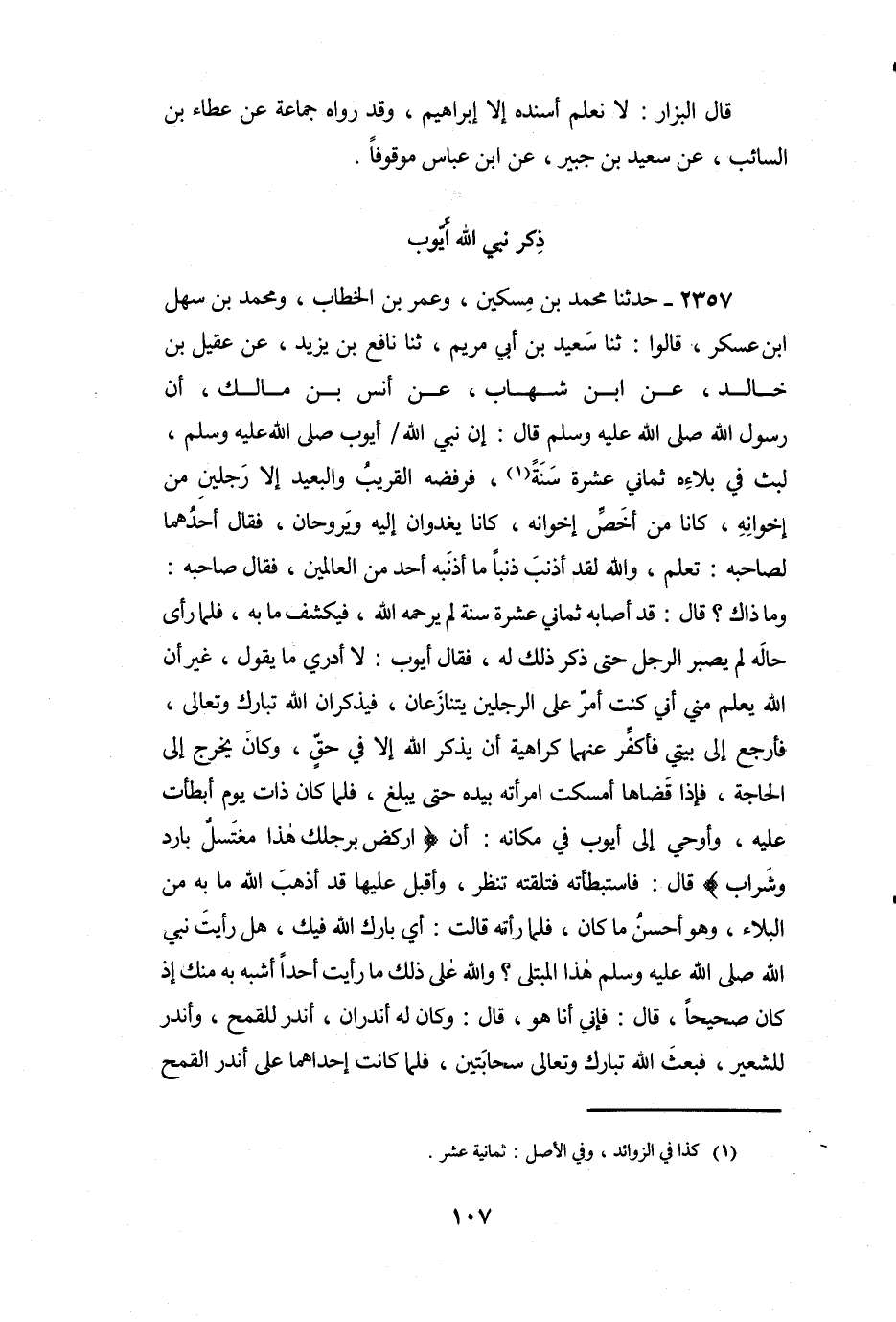 2357 - حَدَّثَنَا مُحَمَّدُ بنُ مِسْكِينٍ، وَعُمَرُ بْنُ الْخَطَّابِ، وَمُحَمَّدُ بْنُ سَهْلِ بْنِ عَسْكَرٍ، قَالُوا: ثنا سَعِيدُ بْنُ أَبِي مَرْيَمَ، ثنا نَافِعُ بْنُ يَزِيدَ، عَنْ عُقَيْلِ بْنِ خَالِدٍ، عَنِ ابْنِ شِهَابٍ، عَنْ أَنَسِ بْنِ مَالِكٍ، أَنَّ رَسُولَ اللَّهِ صَلَّى اللَّهُ عَلَيْهِ وَسَلَّمَ قَالَ: " إِنَّ نَبِيَّ اللَّهِ أَيُّوبَ صَلَّى اللَّهُ عَلَيْهِ وَسَلَّمَ، لَبِثَ فِي بَلاءِهِ ثَمَانِي عَشْرَةَ سَنَةً، فَرَفَضَهُ الْقَرِيبُ وَالْبَعِيدُ إِلا رَجُلَيْنِ مِنْ إِخْوَانِهِ، كَانَا مِنْ أَخَصِّ إِخْوَانِهِ، كَانَا يَغْدُوَانِ إِلَيْهِ وَيَرُوحَانِ، فَقَالَ أَحَدُهُمَا لِصَاحِبِهِ: تَعْلَمُ، وَاللَّهِ لَقَدْ أَذْنَبَ ذَنْبًا مَا أَذْنَبَهُ أَحَدٌ مِنَ الْعَالَمِينَ، فَقَالَ صَاحِبُهُ: وَمَا ذَاكَ؟ قَالَ: قَدْ أَصَابَهُ ثَمَانِي عَشْرَةَ سَنَةً لَمْ يَرْحَمْهُ اللَّهُ، فَيَكْشِفْ مَا بِهِ، فَلَمَّا رَأَى حَالَهُ لَمْ يَصْبِرِ الرَّجُلُ حَتَّى ذَكَرَ ذَلِكَ لَهُ، فَقَالَ أَيُّوبُ: لا أَدْرِي مَا يَقُولُ، غَيْرَ أَنَّ اللَّهَ يَعْلَمُ مِنِّي أَنِّي كُنْتُ أَمُرُّ عَلَى الرَّجُلَيْنِ يَتَنَازَعَانِ، فَيَذْكُرَانِ اللَّهَ تَبَارَكَ وَتَعَالَى، فَأَرْجِعُ إِلَى بَيْتِي فَأُكَفِّرُ عَنْهُمَا , كَرَاهِيَةَ أَنْ يُذْكَرَ اللَّهُ إِلا فِي حَقٍّ، وَكَانَ يَخْرُجُ إِلَى الْحَاجَةِ، فَإِذَا قَضَاهَا أَمْسَكَتِ امْرَأَتُهُ بِيَدِهِ حَتَّى يَبْلُغَ، فَلَمَّا كَانَ ذَاتَ يَوْمٍ أَبْطَأَتْ عَلَيْهِ، وَأُوحِيَ إِلَى أَيُّوب فِي مَكَانِهِ: أَنِ {ارْكُضْ بِرِجْلِكَ هَذَا مُغْتَسَلٌ بَارِدٌ وَشَرَابٌ} [ص: 42] قَالَ: فَاسْتَبْطَأَتْهُ فَتَلَقَّتْهُ تَنْظُرُ، وَأَقْبَلَ عَلَيْهَا قَدْ أَذْهَبَ اللَّهُ مَا بِهِ مِنَ الْبَلاءِ، وَهُوَ أَحْسَنُ مَا كَانَ، فَلَمَّا رَأَتْهُ قَالَتْ: أَيْ بَارَكَ اللَّهُ فِيكَ، هَلْ رَأَيْتَ نَبِيَّ اللَّهِ صَلَّى اللَّهُ عَلَيْهِ وَسَلَّمَ هَذَا الْمُبْتَلَى؟ وَاللَّهِ عَلَى ذَلِكَ مَا رَأَيْتُ أَحَدًا أَشْبَهَ بِهِ مِنْكَ إِذْ كَانَ صَحِيحًا، قَالَ: فَإِنِّي أنا هُوَ، قَالَ: وَكَانَ لَهُ أَنْدَرَانِ، أَنْدَرٌ لِلْقَمْحِ، وَأَنْدَرٌ لِلشَّعِيرِ، فَبَعَثَ اللَّهُ تَبَارَكَ وَتَعَالَى سَحَابَتَيْنِ، فَلَمَّا كَانَتْ إِحْدَاهُمَا عَلَى أَنْدَرِ الْقَمْحِ