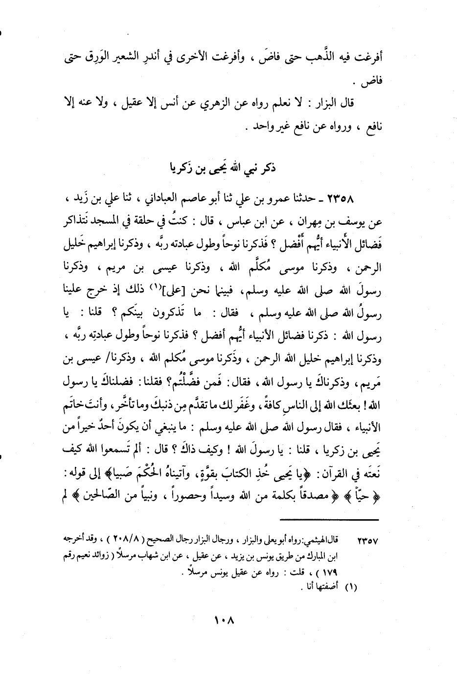 2358 - حَدَّثَنَا عَمْرُو بْنُ عَلِيٍّ، ثنا أَبُو عَاصِمٍ الْعَبَّادَانِيُّ، ثنا عَلِيُّ بْنُ زَيْدٍ، عَنْ يُوسُفَ بْنِ مِهْرَانَ، عَنِ ابْنِ عَبَّاسٍ، قَالَ: كُنْتُ فِي حَلْقَةٍ فِي الْمَسْجِدِ نَتَذَاكَرُ فَضَائِلَ الأَنْبِيَاءِ أَيُّهُمْ أَفْضَلُ؟ فَذَكَرْنَا نُوحًا وَطُولَ عِبَادَتِهِ رَبَّهُ، وَذَكَرْنَا إِبْرَاهِيمَ خَلِيلَ الرَّحْمَنِ، وَذَكَرْنَا مُوسَى مُكَلِّمَ اللَّهِ، وَذَكَرْنَا عِيسَى ابْنَ مَرْيَمَ، وَذَكَرْنَا رَسُولَ اللَّهِ صَلَّى اللَّهُ عَلَيْهِ وَسَلَّمَ، فَبَيْنَمَا نَحْنُ عَلَى ذَلِكَ إِذْ خَرَجَ عَلَيْنَا رَسُولُ اللَّهِ صَلَّى اللَّهُ عَلَيْهِ وَسَلَّمَ، فَقَالَ: «مَا تَذْكُرُونَ بَيْنَكُمْ؟» قُلْنَا: يَا رَسُولَ اللَّهِ: ذَكَرْنَا فَضَائِلَ الأَنْبِيَاءِ أَيُّهُمْ أَفْضَلُ؟ فَذَكَرْنَا نُوحًا وَطُولَ عِبَادَتِهِ رَبَّهُ، وَذَكَرْنَا إِبْرَاهِيمَ خَلِيلَ اللَّهِ الرَّحْمَنِ، وَذَكَرْنَا مُوسَى مُكَلِّمَ اللَّهِ، وَذَكَرْنَا عِيسَى ابْنَ مَرْيَمَ، وَذَكَرْنَاكَ يَا رَسُولَ اللَّهِ، فَقَالَ: «فَمَنْ فَضَّلْتُمْ؟» فَقُلْنَا: فَضَّلْنَاكَ يَا رَسُولَ اللَّهِ! بَعَثَكَ اللَّهُ إِلَى النَّاسِ كَافَّةً، وَغَفَرَ لَكَ مَا تَقَدَّمَ مِنْ ذَنْبِكَ وَمَا تَأَخَّرَ، وَأَنْتَ خَاتَمُ الأَنْبِيَاءِ، فَقَالَ رَسُولُ اللَّهِ صَلَّى اللَّهُ عَلَيْهِ وَسَلَّمَ: «مَا يَنْبَغِي أَنْ يَكُونَ أَحَدٌ خَيْرًا مِنْ يَحْيَى بْنِ زَكَرِيَّا» ، قُلْنَا: يَا رَسُولَ اللَّهِ! وَكَيْفَ ذَاكَ؟ قَالَ: " أَلَمْ تَسْمَعُوا اللَّهَ كَيْفَ نَعَتَهُ فِي الْقُرْآنِ: {يَا يَحْيَى خُذِ الْكِتَابَ بِقُوَّةٍ وَآتَيْنَاهُ الْحُكْمَ صَبِيًّا} [مريم: 12] إِلَى قَوْلِهِ: {حَيًّا} [مريم: 15] {مُصَدِّقًا بِكَلِمَةٍ مِنَ اللَّهِ وَسَيِّدًا وَحَصُورًا وَنَبِيًّا مِنَ الصَّالِحِينَ} [آل عمران: 39] لَمْ