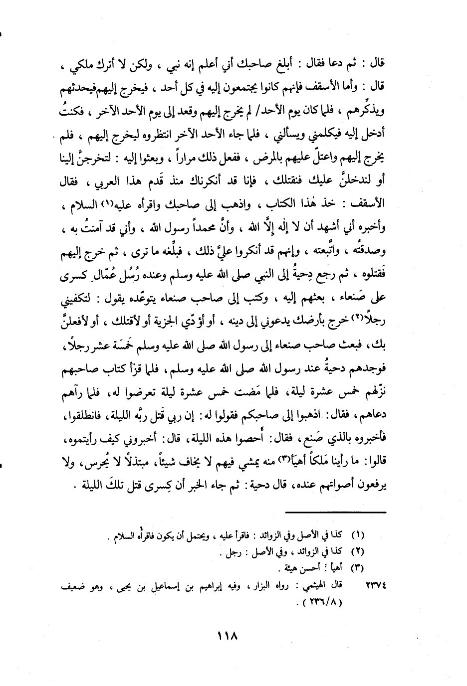 قَالَ: ثُمَّ دَعَا فَقَالَ: أَبْلِغْ صَاحِبَكَ أَنِّي أَعْلَمُ إِنَّهُ نَبِيٌّ، وَلَكِنْ لا أَتْرُكُ مُلْكِي، قَالَ: وَأَمَّا الأُسْقُفُّ فَإِنَّهُمْ كَانُوا يَجْتَمِعُونَ إِلَيْهِ فِي كُلِّ أَحَدٍ، فَيَخْرُجُ إِلَيْهِمْ فَيُحَدِّثُهُمْ وَيُذَكِّرُهُمْ، فَلَمَّا كَانَ يَوْمُ الأَحَدِ لَمْ يَخْرُجْ إِلَيْهِمْ وَقَعَدَ إِلَى يَوْمِ الأَحَدِ الآخَرِ، فَكُنْتُ أَدْخُلُ إِلَيْهِ فَيُكَلِّمُنِي وَيَسْأَلُنِي، فَلَمَّا جَاءَ الأَحَدُ الآخَرُ انْتَظَرُوهُ لِيَخْرُجَ إِلَيْهِمْ، فَلَمْ يَخْرُجْ إِلَيْهِمْ وَاعْتَلَّ عَلَيْهِمْ بِالْمَرَضِ، فَفَعَلَ ذَلِكَ مِرَارًا، وَبَعَثُوا إِلَيْهِ: لَتَخْرُجَنَّ إِلَيْنَا أَوْ لَنَدْخُلَنَّ عَلَيْكَ فَنَقْتُلُكَ، فَإِنَّا قَدْ أَنْكَرْنَاكَ مُنْذُ قَدِمَ هَذَا الْعَرَبِيُّ، فَقَالَ الأُسْقُفُّ: خُذْ هَذَا الْكِتَابَ، وَاذْهَبْ إِلَى صَاحِبِكَ وَاقْرَأْ عَلَيْهِ السَّلامَ، وَأَخْبِرْهُ أَنِّي أَشْهَدُ أَنْ لا إِلَهَ إِلا اللَّهُ، وَأَنَّ مُحَمَّدًا رَسُولُ اللَّهِ، وَأَنِّي قَدْ آمَنْتُ بِهِ، وَصَدَّقْتُهُ، وَاتَّبَعْتُهُ، وَإِنَّهُمْ قَدْ أَنْكَرُوا عَلَيَّ ذَلِكَ، فَبَلِّغْهُ مَا تَرَى، ثُمَّ خَرَجَ إِلَيْهِمْ فَقَتَلُوهُ، ثُمَّ رَجَعَ دِحْيَةُ إِلَى النَّبِيِّ صَلَّى اللَّهُ عَلَيْهِ وَسَلَّمَ وَعِنْدَهُ رُسُلُ عُمَّالِ كِسْرَى عَلَى صَنْعَاءَ، بَعَثَهُمْ إِلَيْهِ، وَكَتَبَ إِلَى صَاحِبِ صَنْعَاءَ يَتَوَعَّدُهُ يَقُولُ: لِتَكْفِيَنِي رَجُلًا خَرَجَ بِأَرْضِكَ يَدْعُونِي إِلَى دِينِهِ، أَوْ أُؤَدِّي الْجِزْيَةَ أَوْ لأَقْتُلُكَ، أَوْ لأَفْعَلَنَّ بِكَ، فَبَعَثَ صَاحِبُ صَنْعَاءَ إِلَى رَسُولِ اللَّهِ صَلَّى اللَّهُ عَلَيْهِ وَسَلَّمَ خَمْسَةَ عَشَرَ رَجُلًا، فَوَجَدَهُمْ دِحْيَةُ عِنْدَ رَسُولِ اللَّهِ صَلَّى اللَّهُ عَلَيْهِ وَسَلَّمَ، فَلَمَّا قَرَأَ كِتَابَ صَاحِبِهِمْ نَزَّلَهُمْ خَمْسَ عَشْرَةَ لَيْلَةً، فَلَمَّا مَضَتْ خَمْسَ عَشْرَةَ لَيْلَةً تَعَرَّضُوا لَهُ، فَلَمَّا رَآهُمْ دَعَاهُمْ، فَقَالَ: اذْهَبُوا إِلَى صَاحِبِكُمْ فَقُولُوا لَهُ: «إِنَّ رَبِّي قَتَلَ رَبَّهُ اللَّيْلَةَ» فَانْطَلَقُوا، فَأَخْبَرُوُه بِالَّذِي صَنَعَ، فَقَالَ: أَحْصُوا هَذِهِ اللَّيْلَةُ، قَالَ: أَخْبِرُونِي كَيْفَ رَأَيْتُمُوهُ، قَالُوا: مَا رَأَيْنَا مَلِكًا أَهْيَأَ مِنْهُ يَمْشِي فِيهِمْ لا يَخَافُ شَيْئًا، مُبْتذلا لا يُحْرَسُ، وَلا يَرْفَعُونَ أَصْوَاتَهُمْ عِنْدَهُ، قَالَ دِحْيَةُ: ثُمَّ جَاءَ الْخَبَرُ أَنَّ كِسْرَى قُتِلَ تِلْكَ اللَّيْلَةَ.