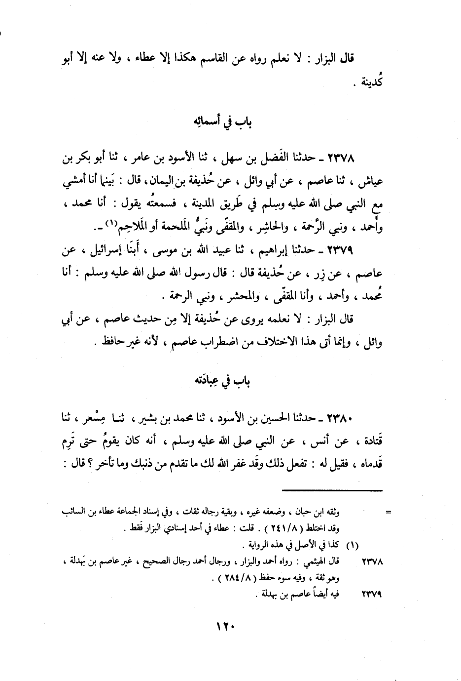 2378 - حَدَّثَنَا الْفَضْلُ بْنُ سَهْلٍ، ثنا الأَسْوَدُ بْنُ عَامِرٍ، ثنا أَبُو بَكْرِ بْنُ عَيَّاشٍ، ثنا عَاصِمٌ، عَنْ أَبِي وَائِلٍ، عَنْ حُذَيْفَةَ بْنِ الْيَمَانِ، قَالَ: بَيْنَمَا أَنَا أَمْشِي مَعَ النَّبِيِّ صَلَّى اللَّهُ عَلَيْهِ وَسَلَّمَ فِي طَرِيقِ الْمَدِينَةِ، فَسَمِعْتُهُ يَقُولُ: «أَنَا مُحَمَّدٌ، وَأَحْمَدُ، وَنَبِيُّ الرَّحْمَةِ، وَالْحَاشِرُ، وَالْمُقَفَّى , وَنَبِيُّ الْمَلْحَمَةِ أَوِ الْمَلاحِمِ» .