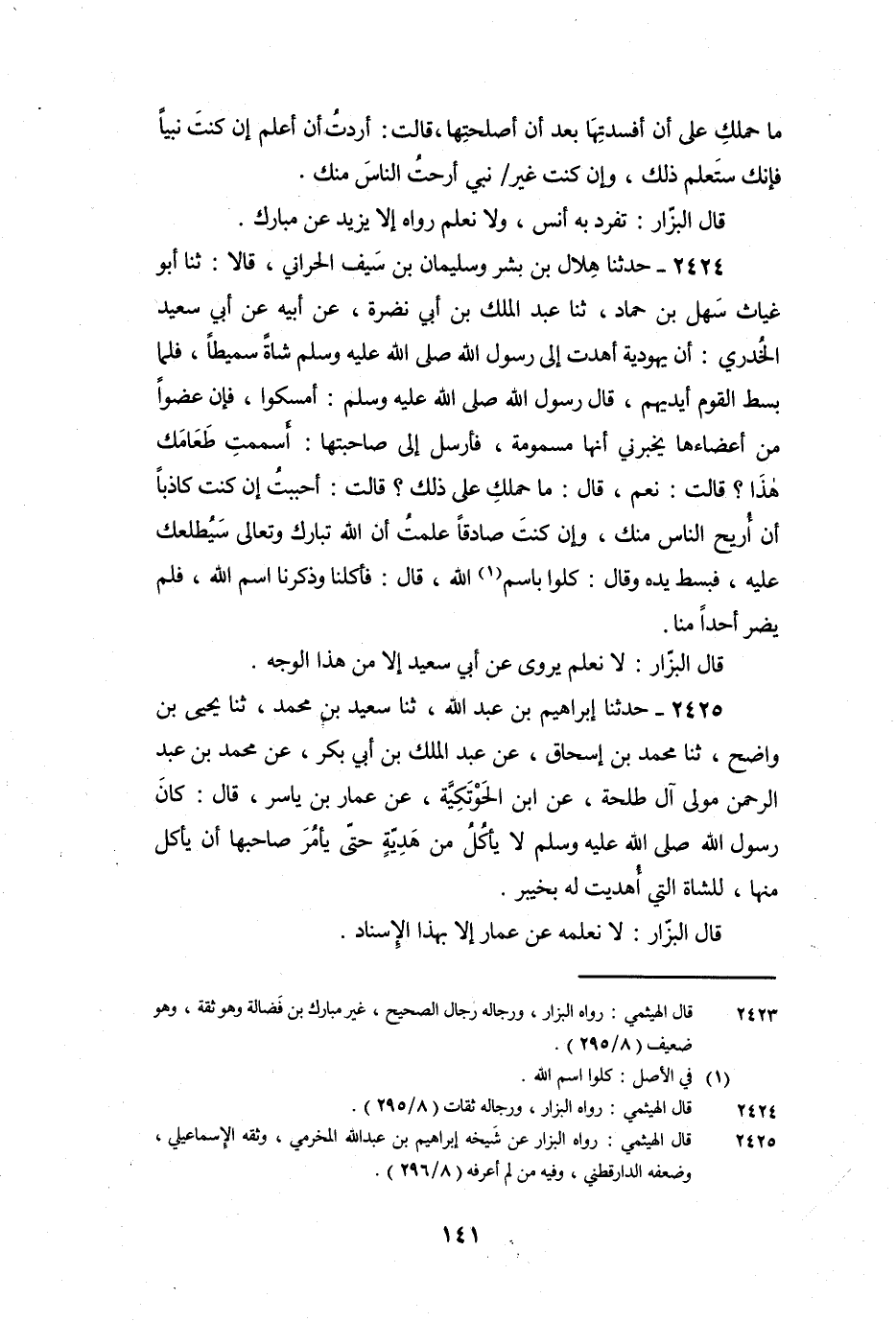 2424 - حَدَّثَنَا هِلالُ بْنُ بِشْرٍ , وَسُلَيْمَانُ بْنُ سَيْفٍ الْحَرَّانِيُّ، قَالا: ثنا أَبُو غِيَاثٍ سَهْلُ بْنُ حَمَّادٍ، ثنا عَبْدُ الْمَلِكِ بْنُ أَبِي نَضْرَةَ، عَنْ أَبِيهِ , عَنْ أَبِي سَعِيدٍ الْخُدْرِيِّ: أَنَّ يَهُودِيَّةً أَهْدَتْ إِلَى رَسُولِ اللَّهِ صَلَّى اللَّهُ عَلَيْهِ وَسَلَّمَ شَاةً سَمِيطًا، فَلَمَّا بَسَطَ الْقَوْمُ أَيْدِيَهُمْ، قَالَ رَسُولُ اللَّهِ صَلَّى اللَّهُ عَلَيْهِ وَسَلَّمَ: «أَمْسِكُوا، فَإِنَّ عُضْوًا مِنْ أَعْضَائِهَا يُخْبِرُنِي أَنَّهَا مَسْمُومَةٌ» فَأَرْسَلَ إِلَى صَاحِبَتِهَا: «أَسَمَمْتِ طَعَامَكِ هَذَا؟» قَالَتْ: نَعَمْ، قَالَ: «مَا حَمَلَكِ عَلَى ذَلِكَ؟» قَالَتْ: أَحْبَبْتُ إِنْ كُنْتَ كَاذِبًا أَنْ أُرِيحَ النَّاسَ مِنْكَ، وَإِنْ كُنْتَ صَادِقًا عَلِمْتُ أَنَّ اللَّهُ تَبَارَكَ وَتَعَالَى سَيُطْلِعُكَ عَلَيْهِ، فَبَسَطَ يَدَهُ وَقَالَ: «كُلُوا بِسْمِ اللَّهِ» قَالَ: فَأَكَلْنَا وَذَكَرْنَا اسْمَ اللَّهِ، فَلَمْ يَضُرَّ أَحَدًا مِنَّا.