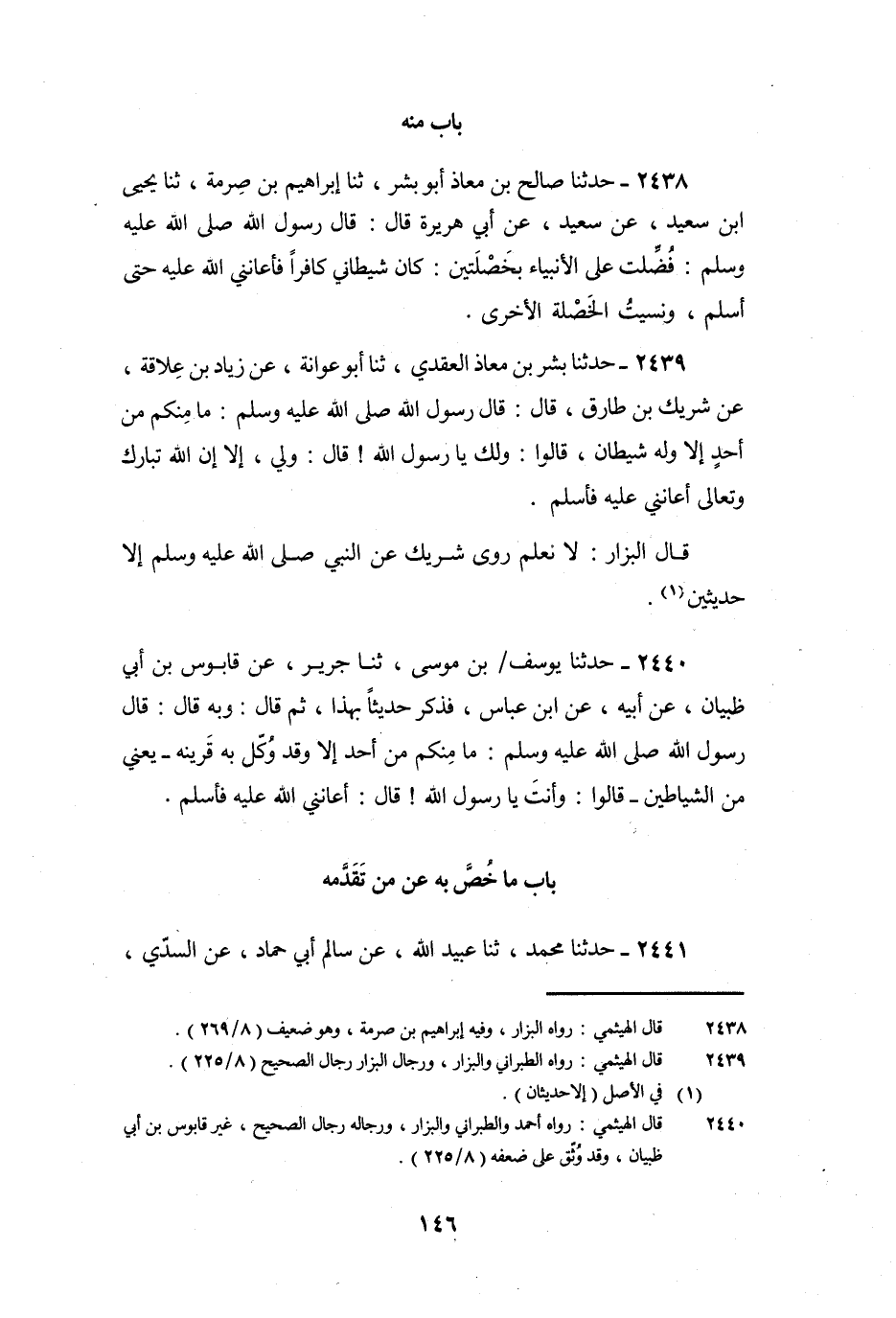 2438 - حَدَّثَنَا صَالِحُ بْنُ مُعَاذٍ أَبُو بِشْرٍ، ثنا إِبْرَاهِيمُ بْنُ صِرْمَةَ، ثنا يَحْيَى بْنُ سَعِيدٍ، عَنْ سَعِيدٍ، عَنْ أَبِي هُرَيْرَةَ قَالَ: قَالَ رَسُولُ اللَّهِ صَلَّى اللَّهُ عَلَيْهِ وَسَلَّمَ: " فُضِّلْتُ عَلَى الأَنْبِيَاءِ بِخَصْلَتَيْنِ: كَانَ شَيْطَانِي كَافِرًا فَأَعَانَنِي اللَّهُ عَلَيْهِ حَتَّى أَسْلَمَ....