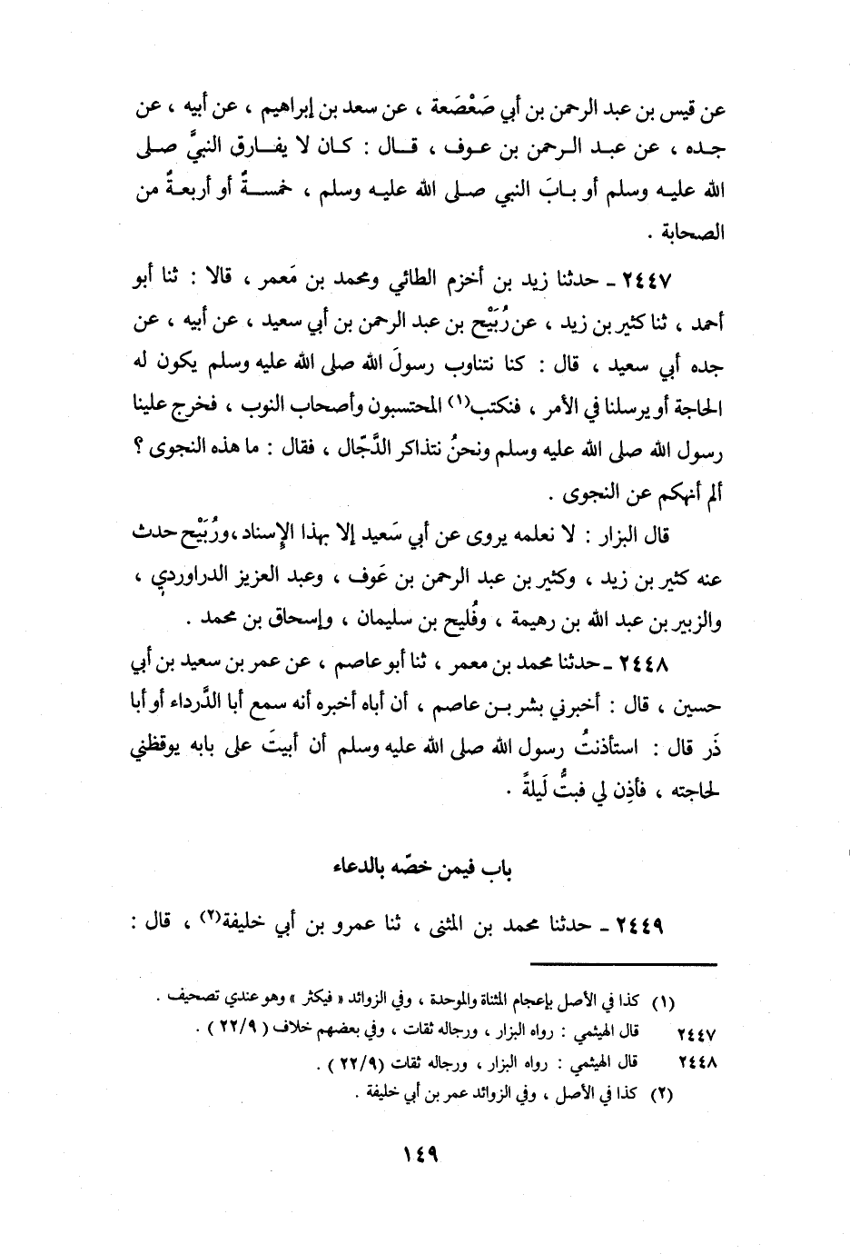 2447 - حَدَّثَنَا زَيْدُ بْنُ أَخْزَمَ الطَّائِيُّ , وَمُحَمَّدُ بْنُ مَعْمَرٍ، قَالا: ثنا أَبُو أَحْمَدَ، ثنا كَثِيرُ بْنُ زَيْدٍ، عَنْ رُبَيْحِ بْنِ عَبْدِ الرَّحْمَنِ بْنِ أَبِي سَعِيدٍ، عَنْ أَبِيهِ، عَنْ جَدِّهِ أَبِي سَعِيدٍ، قَالَ: كُنَّا نَتَنَاوَبُ رَسُولَ اللَّهِ صَلَّى اللَّهُ عَلَيْهِ وَسَلَّمَ يَكُونُ لَهُ الْحَاجَةُ أَوْ يُرْسِلُنَا فِي الأَمْرِ، فَيَكْثُرُ الْمُحْتَسبُونَ وَأَصْحَابُ النُّوَبِ، فَخَرَجَ عَلَيْنَا رَسُولُ اللَّهِ صَلَّى اللَّهُ عَلَيْهِ وَسَلَّمَ وَنَحْنُ نَتَذَاكَرُ الدَّجَّالَ، فَقَالَ: «مَا هَذِهِ النَّجْوَى؟ أَلَمْ أَنْهَكُمْ عَنِ النَّجْوَى» .