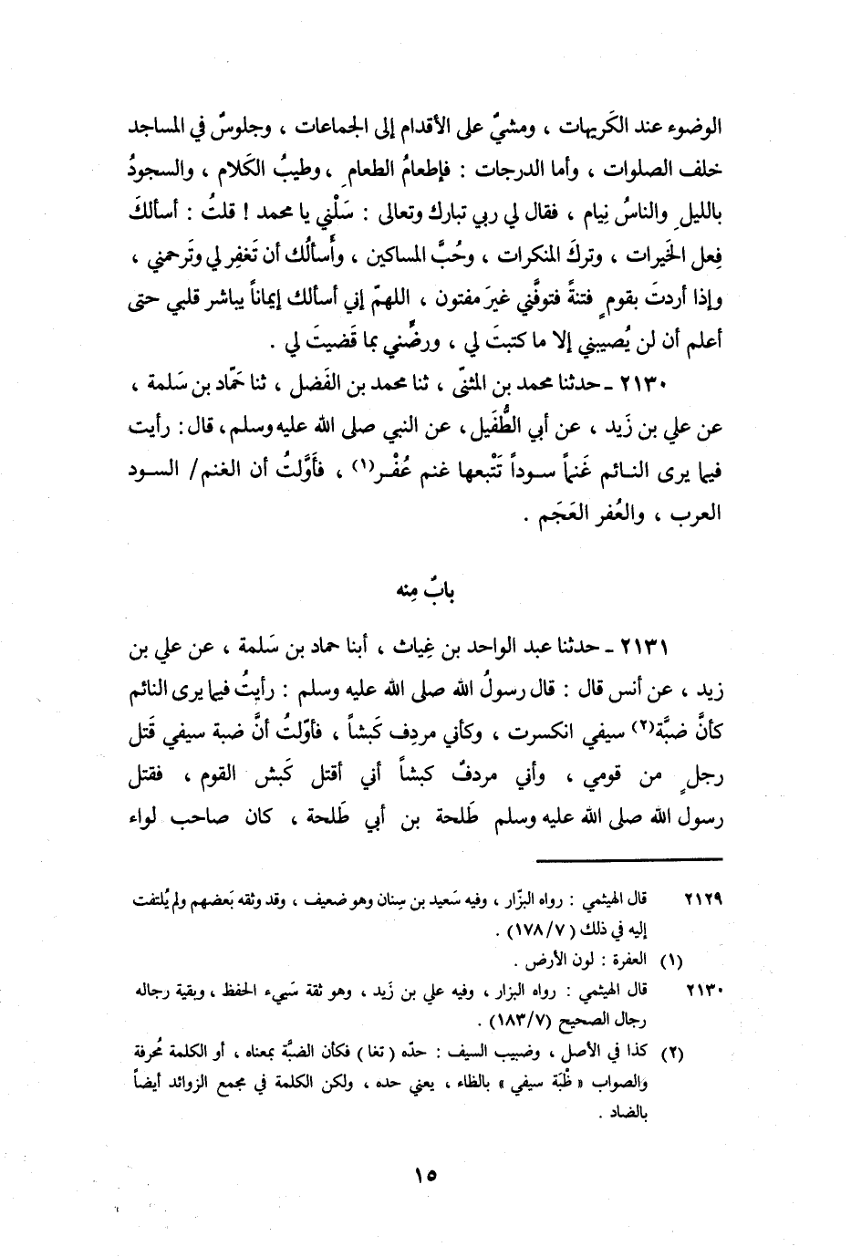 2130 - حَدَّثَنَا مُحَمَّدُ بْنُ الْمُثَنَّى، ثنا مُحَمَّدُ بْنُ الْفَضْلُ، ثنا حَمَّادُ بْنُ سَلَمَةَ، عَنْ عَلِيِّ بْنِ زَيْدٍ، عَنْ أَبِي الطُّفَيْلِ، عَنِ النَّبِيِّ صَلَّى اللَّهُ عَلَيْهِ وَسَلَّمَ، قَالَ: رَأَيْتُ فِيمَا يَرَى النَّائِمُ غَنَمًا سُودًا تَتْبَعُهَا غَنَمٌ عُفْرٌ، فَأَوَّلْتُ أَنَّ الْغَنَمَ السُّودَ الْعَرَبُ، وَالْعُفْرُ الْعَجَمُ