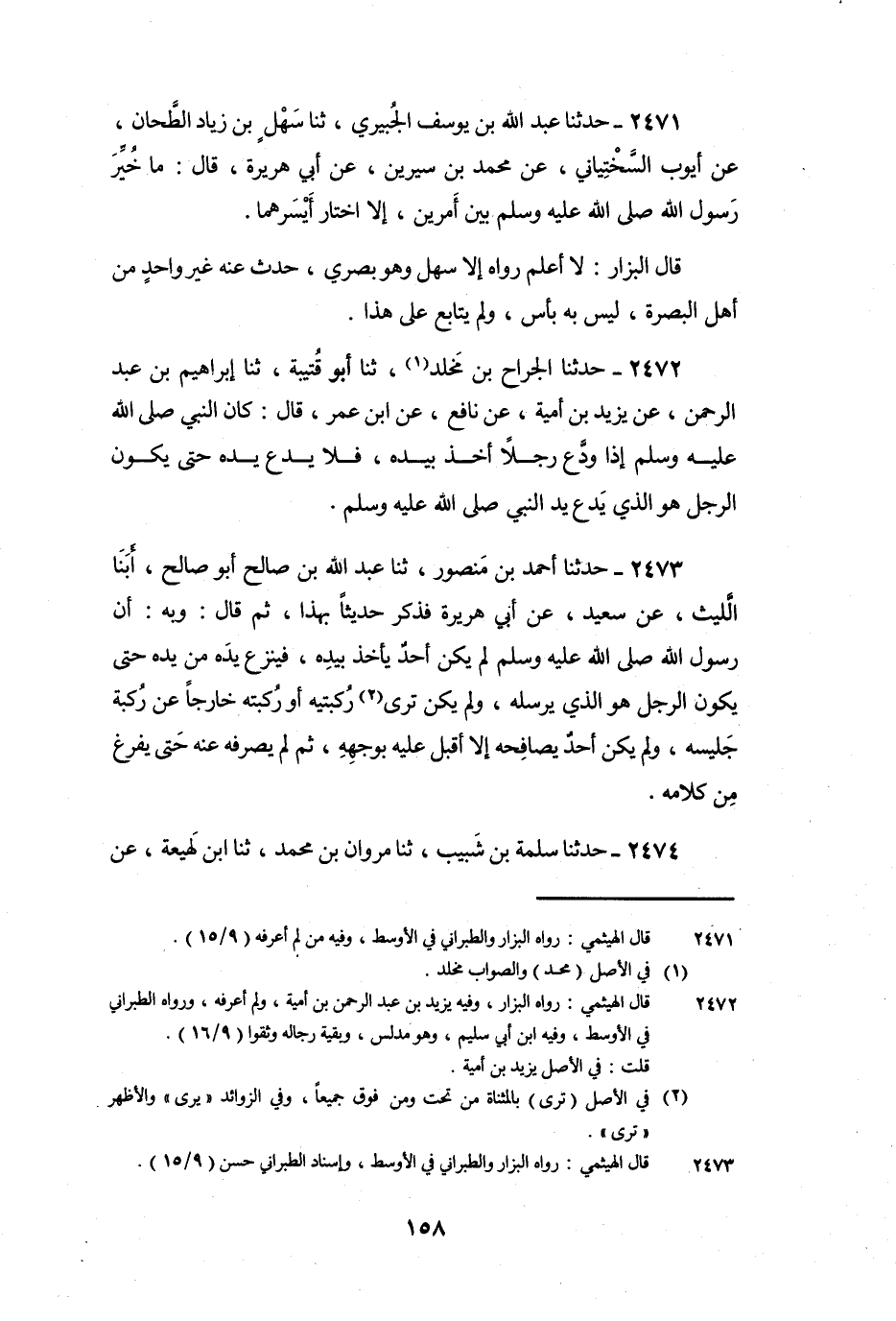 2472 - حَدَّثَنَا الْجَرَّاحُ بْنُ مَخْلَدٍ، ثنا أَبُو قُتَيْبَةَ، ثنا إِبْرَاهِيمُ بْنُ عَبْدِ الرَّحْمَنِ يَزِيدَ بْنِ أُمَيَّةَ، عَنْ نَافِعٍ، عَنِ ابْنِ عُمَرَ، قَالَ: كَانَ النَّبِيُّ صَلَّى اللَّهُ عَلَيْهِ وَسَلَّمَ إِذَا وَدَّعَ رَجُلا أَخَذَ بِيَدِهِ، فَلا يَدَعُ يَدَهُ حَتَّى يَكُونَ الرَّجُلُ هُوَ الَّذِي يَدَعُ يَدَ النَّبِيِّ صَلَّى اللَّهُ عَلَيْهِ وَسَلَّمَ.