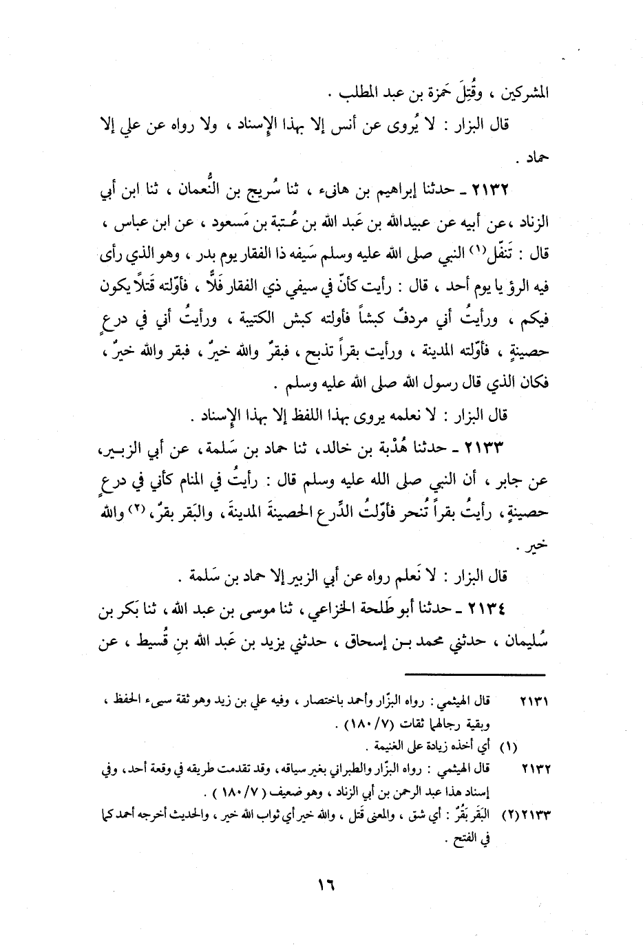 2133 - حَدَّثَنَا هُدْبَةُ بْنُ خَالِدٍ، ثنا حَمَّادُ بْنُ سَلَمَةَ، عَنْ أَبِي الزُّبَيْرِ، عَنْ جَابِرٍ، أَنَّ النَّبِيَّ صَلَّى اللَّهُ عَلَيْهِ وَسَلَّمَ قَالَ: «رَأَيْتُ فِي الْمَنَامِ كَأَنِّي فِي دِرْعٍ حَصِينَةٍ، رَأَيْتُ بَقَرًا تُنْحَرُ فَأَوَّلْتُ الدِّرْعَ الْحَصِينَةَ الْمَدِينَةَ، وَالْبَقَرَ بَقَرٌ، وَاللَّهِ خَيْرٌ» .