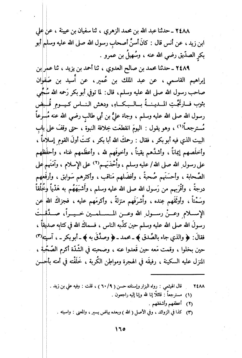 2488 - حَدَّثَنَا عَبْدُ اللَّهِ بْنُ مُحَمَّدٍ الزُّهْرِيُّ، ثنا سُفْيَانُ بْنُ عُيَيْنَةَ، عَنْ عَلِيِّ بْنِ زَيْدٍ، عَنْ أَنَسٍ قَالَ: كَانَ أَسَنَّ أَصْحَابِ رَسُولِ اللَّهِ صَلَّى اللَّهُ عَلَيْهِ وَسَلَّمَ أَبُو بَكْرٍ الصِّدِّيقُ رَضِيَ اللَّهُ عَنْهُ، وَسُهَيْلُ بْنُ عَمْرٍو.
