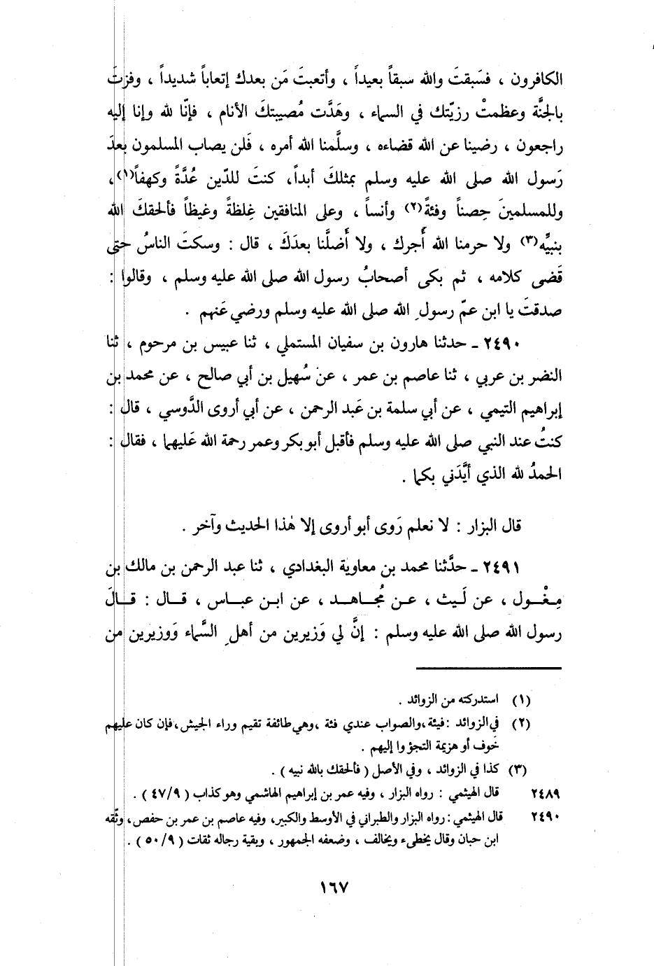 2490 - حَدَّثَنَا هَارُونُ بْنُ سُفْيَانَ الْمُسْتَمْلِي، ثنا عُبَيْسُ بْنُ مَرْحُومٍ، ثنا النَّضْرُ بْنُ عَرَبِيٍّ، ثنا عَاصِمُ بْنُ عُمَرَ، عَنْ سُهَيْلِ بْنِ أَبِي صَالِحٍ، عَنْ مُحَمَّدِ بْنِ إِبْرَاهِيمَ التَّيْمِيِّ، عَنْ أَبِي سَلَمَةَ بْنِ عَبْدِ الرَّحْمَنِ، عَنْ أَبِي أَرْوَى الدَّوْسِيِّ، قَالَ: كُنْتُ عِنْدَ النَّبِيِّ صَلَّى اللَّهُ عَلَيْهِ وَسَلَّمَ فَأَقْبَلَ أَبُو بَكْرٍ وَعُمَرُ رَحْمَةُ اللَّهِ عَلَيْهِمَا، فَقَالَ «الْحَمْدُ لِلَّهِ الَّذِي أَيَّدَنِي بِكُمَا» .