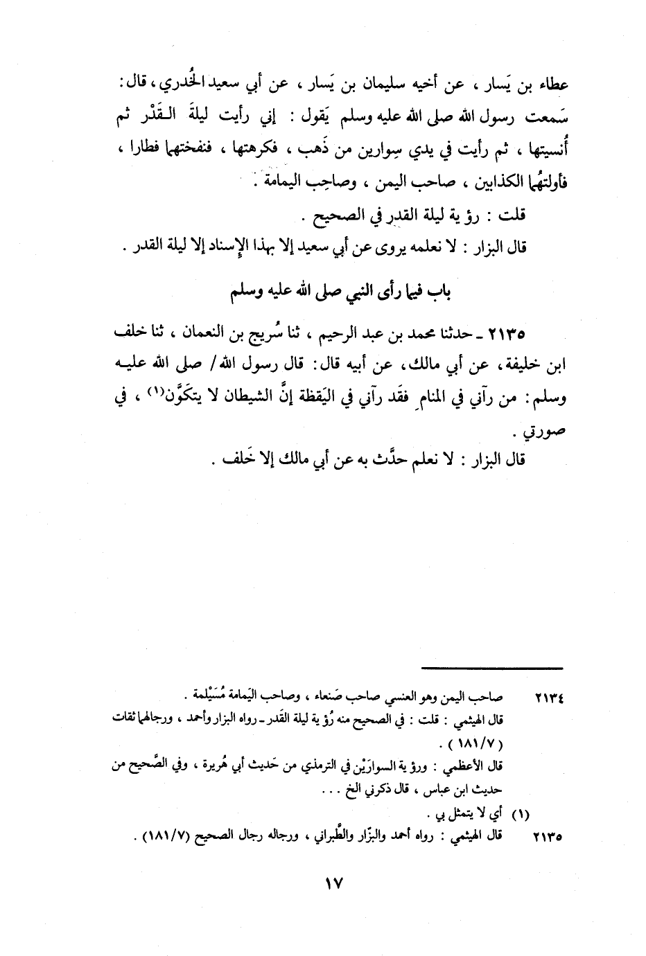 2135 - حَدَّثَنَا مُحَمَّدُ بْنُ عَبْدِ الرَّحِيمِ، ثنا سُرَيْجُ بْنُ النُّعْمَانِ، ثنا خَلَفُ بْنُ خَلِيفَةَ، عَنْ أَبِي مَالِكٍ، عَنْ أَبِيهِ قَالَ: قَالَ رَسُولُ اللَّهِ صَلَّى اللَّهُ عَلَيْهِ وَسَلَّمَ: «مَنْ رَآنِي فِي الْمَنَامِ فَقَدْ رَآنِي فِي الْيَقَظَةِ , إِنَّ الشَّيْطَانَ لا يَتَكَوَّنُ فِي صُورَتِي» .