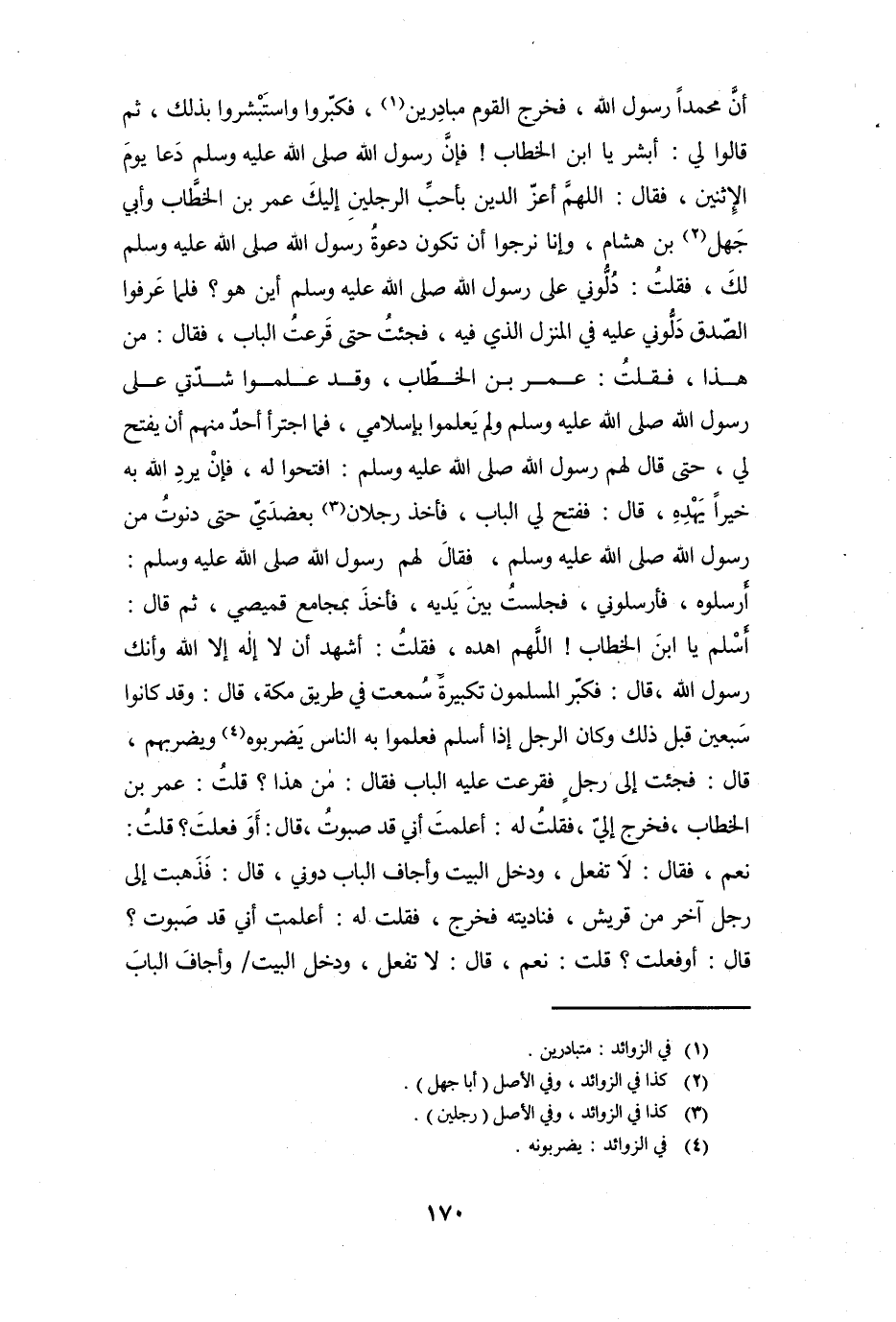 أَنَّ مُحَمَّدًا رَسُولُ اللَّهِ، فَخَرَجَ الْقَوْمُ مُبَادِرِينَ، فَكَبَّرُوا وَاسْتَبْشَرُوا بِذَلِكَ، ثُمَّ قَالُوا لِي: أَبْشِرْ يَابْنَ الْخَطَّابِ! فَإِنَّ رَسُولَ اللَّهِ صَلَّى اللَّهُ عَلَيْهِ وَسَلَّمَ دَعَا يَوْمَ الاثْنَيْنِ، فَقَالَ: «اللَّهُمَّ أَعِزَّ الدِّينَ بِأَحَبِّ الرَّجُلَيْنِ إِلَيْكَ عُمَرَ بْنِ الْخَطَّابِ وَأَبِي جَهْلِ بْنِ هِشَامٍ» وَإِنَّا نَرْجُو أَنْ تَكُونَ دَعْوَةُ رَسُولِ اللَّهِ صَلَّى اللَّهُ عَلَيْهِ وَسَلَّمَ لَكَ، فَقُلْتُ: دُلُّونِي عَلَى رَسُولِ اللَّهِ صَلَّى اللَّهُ عَلَيْهِ وَسَلَّمَ أَيْنَ هُوَ؟ فَلَمَّا عَرَفُوا الصِّدْقَ دَلُّونِي عَلَيْهِ فِي الْمَنْزِلِ الَّذِي فِيهِ، فَجِئْتُ حَتَّى قَرَعْتُ الْبَابَ، فَقَالَ: «مَنْ هَذَا؟» ، فَقُلْتُ: عُمَرُ بْنُ الْخَطَّابِ، وَقَدْ عَلِمُوا شِدَّتِي عَلَى رَسُولِ اللَّهِ صَلَّى اللَّهُ عَلَيْهِ وَسَلَّمَ وَلَمْ يَعْلَمُوا بِإِسْلامِي، فَمَا اجْتَرَأَ أَحَدٌ مِنْهُمْ أَنْ يَفْتَحَ لِي، حَتَّى قَالَ لَهُمْ رَسُولُ اللَّهِ صَلَّى اللَّهُ عَلَيْهِ وَسَلَّمَ: «افْتَحُوا لَهُ، فَإِنْ يُرِدِ اللَّهُ بِهِ خَيْرًا يَهْدِهِ» قَالَ: فَفُتِحَ لِي الْبَابُ، فَأَخَذَ رَجُلانِ بِعَضُدِي حَتَّى دَنَوْتُ مِنْ رَسُولِ اللَّهِ صَلَّى اللَّهُ عَلَيْهِ وَسَلَّمَ، فَقَالَ لَهُمْ رَسُولُ اللَّهِ صَلَّى اللَّهُ عَلَيْهِ وَسَلَّمَ: «أَرْسِلُوهُ» فَأَرْسَلُونِي، فَجَلَسْتُ بَيْنَ يَدَيْهِ، فَأَخَذَ بِمَجَامِعِ قَمِيصِي، ثُمَّ قَالَ: «أَسْلِمْ يَابْنَ الْخَطَّابِ! اللَّهُمَّ اهْدِهِ» فَقُلْتُ: أَشْهَدُ أَنْ لا إِلَهَ إِلا اللَّهُ وَأَنَّكَ رَسُولُ اللَّهِ، قَالَ: فَكَبَّرَ الْمُسْلِمُونَ تَكْبِيرَةً سُمِعَتْ فِي طَرِيقِ مَكَّةَ، قَالَ: وَقَدْ كَانُوا سَبْعِينَ قَبْلَ ذَلِكَ , وَكَانَ الرَّجُلُ إِذَا أَسْلَمَ فَعَلِمُوا بِهِ النَّاسُ يَضْرِبُوهُ وَيَضْرِبُهُمْ، قَالَ: فَجِئْتُ إِلَى رَجُلٍ فَقَرَعْتُ عَلَيْهِ الْبَابَ فَقَالَ: مَنْ هَذَا؟ قُلْتُ: عُمَرُ بْنُ الْخَطَّابِ، فَخَرَجَ إِلَيَّ، فَقُلْتُ لَهُ: أَعَلِمْتَ أَنِّي قَدْ صَبَوْتُ، قَالَ: أَوْ فَعَلْتَ؟ قُلْتُ: نَعَمْ، فَقَالَ: لا تَفْعَلْ، وَدَخَلَ الْبَيْتَ وَأَجَافَ الْبَابَ دُونِي، قَالَ: فَذَهَبْتُ إِلَى رَجُلٍ آخَرَ مِنْ قُرَيْشٍ، فَنَادَيْتُهُ فَخَرَجَ، فَقُلْتُ لَهُ: أَعَلِمْتَ أَنِّي قَدْ صَبَوْتُ؟ قَالَ: أَوَفَعَلْتَ؟ قُلْتُ: نَعَمْ، قَالَ: لا تَفْعَلْ، وَدَخَلَ الْبَيْتَ وَأَجَافَ الْبَابَ