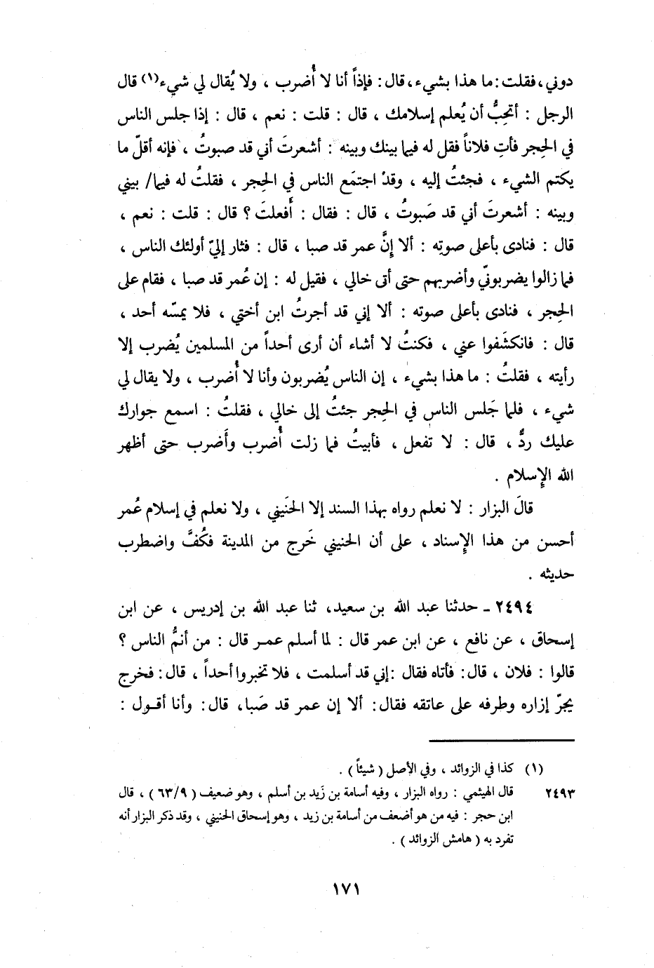 قَالَ الْبَزَّارُ: لا نَعْلَمُ رَوَاهُ بِهَذَا السَّنَدِ إِلا الْحُنَيْنِيُّ، وَلا نَعْلَمُ فِي إِسْلامِ عُمَرَ أَحْسَنَ مِنْ هَذَا الإِسْنَادِ، عَلَى أَنَّ الْحُنَيْنِيَّ خَرَجَ مِنَ الْمَدِينَةِ فَكُفَّ وَاضْطَرَبَ حَدِيثُهُ.