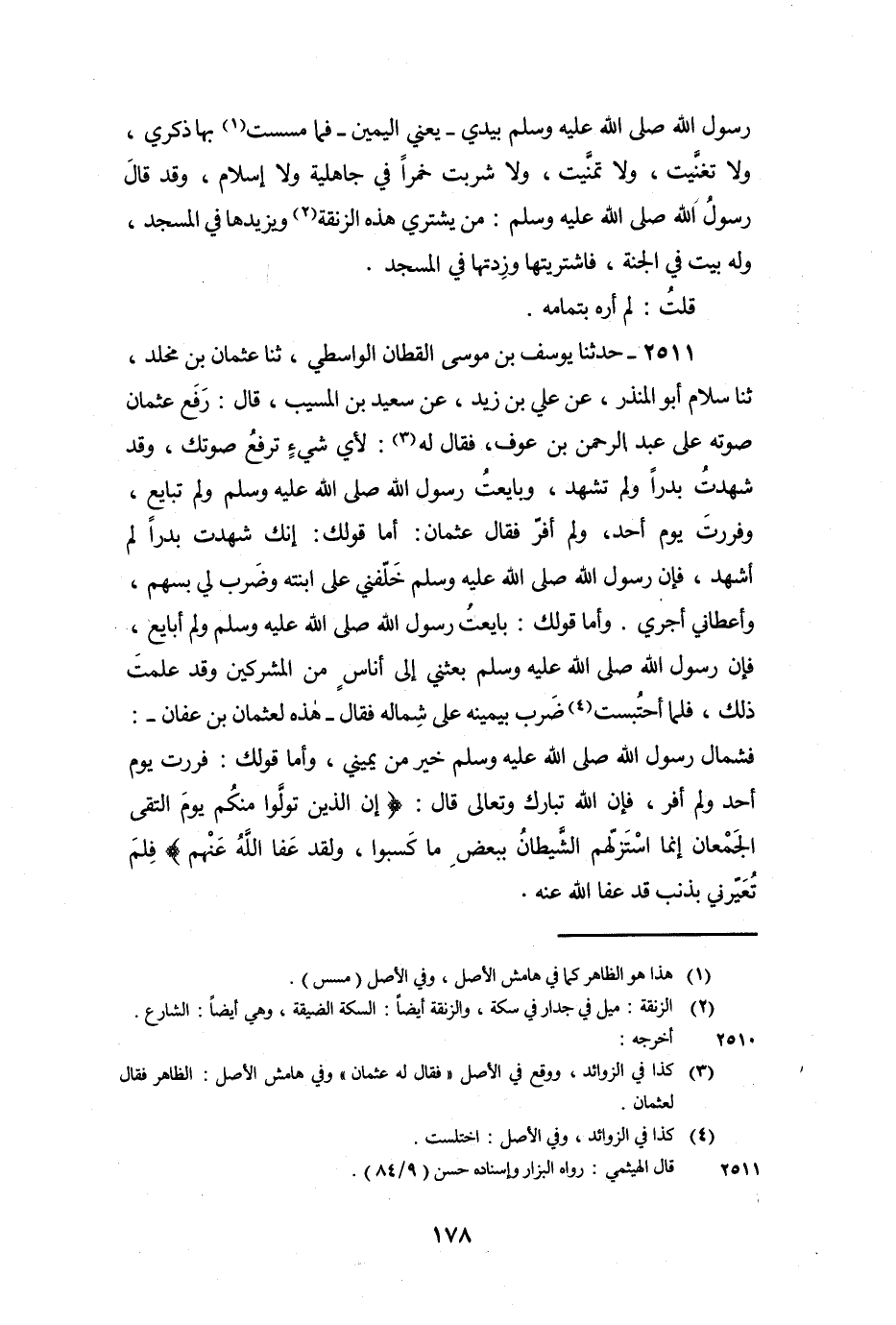2511 - حَدَّثَنَا يُوسُفُ بْنُ مُوسَى الْقَطَّانُ الْوَاسِطِيُّ، ثنا عُثْمَانُ بْنُ مَخْلَدٍ، ثنا سَلامٌ أَبُو الْمُنْذِرِ، عَنْ عَلِيِّ بْنِ زَيْدٍ، عَنْ سَعِيدِ بْنِ الْمُسَيِّبِ، قَالَ: رَفَعَ عُثْمَانُ صَوْتَهُ عَلَى عَبْدِ الرَّحْمَنِ بْنِ عَوْفٍ، فَقَالَ لَهُ: لأَيِّ شَيْءٍ تَرْفَعُ صَوْتَكَ، وَقَدْ شَهِدْتُ بَدْرًا وَلَمْ تَشْهَدْ، وَبَايَعْتُ رَسُولَ اللَّهِ صَلَّى اللَّهُ عَلَيْهِ وَسَلَّمَ وَلَمْ تُبَايِعْ، وَفَرَرْتَ يَوْمَ أُحُدٍ، وَلَمْ أَفِرَّ , فَقَالَ عُثْمَانُ: أَمَّا قَوْلُكَ: إِنَّكَ شَهِدْتَ بَدْرًا وَلَمْ أَشْهَدْ، فَإِنَّ رَسُولَ اللَّهِ صَلَّى اللَّهُ عَلَيْهِ وَسَلَّمَ خَلَّفَنِي عَلَى ابْنَتِهِ وَضَرَبَ لِي بِسَهْمٍ، وَأَعْطَانِي أَجْرِي.
