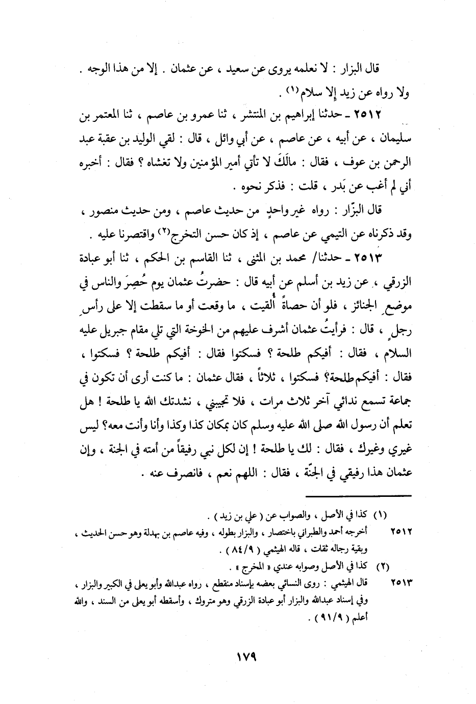 2513 - حَدَّثَنَا مُحَمَّدُ بْنُ الْمُثَنَّى، ثنا الْقَاسِمُ بْنُ الْحَكَمِ، ثنا أَبُو عُبَادَةَ الزُّرَقِيُّ، عَنْ زَيْدِ بْنِ أَسْلَمَ , عَنْ أَبِيهِ قَالَ: حَضَرْتُ عُثْمَانَ يَوْمَ حُصِرَ وَالنَّاسُ فِي مَوْضِعِ الْجَنَائِزِ، فَلَوْ أَنَّ حَصَاةً أُلْقِيَتْ، مَا وَقَعَتْ أَوْ مَا سَقَطَتْ إِلا عَلَى رَأْسِ رَجُلٍ، قَالَ: فَرَأَيْتُ عُثْمَانَ أَشْرَفَ عَلَيْهِمْ مِنَ الْخَوْخَةِ الَّتِي تَلِي مَقَامَ جِبْرِيلَ عَلَيْهِ السلام، فَقَالَ: أَفِيكُمْ طَلْحَةُ؟ فَسَكَتُوا فَقَالَ: أَفِيكُمْ طَلْحَةُ؟ فَسَكَتُوا، فَقَالَ: أَفِيكُمْ طَلْحَةُ، فَسَكَتُوا، ثَلاثًا، فَقَالَ عُثْمَانُ: مَا كُنْتُ أَرَى أَنْ تَكُونَ فِي جَمَاعَةٍ تَسْمَعُ نِدَائِي آخرَ ثَلاثَ مَرَّاتٍ، فَلا تُجِيبُنِي، نَشَدْتُكَ اللَّهَ يَا طَلْحَةُ! هَلْ تَعْلَمُ أَنَّ رَسُولَ اللَّهِ صَلَّى اللَّهُ عَلَيْهِ وَسَلَّمَ كَانَ بِمَكَانِ كَذَا وَكَذَا وَأَنَا وَأَنْتَ مَعَهُ؟ لَيْسَ غَيْرِي وَغَيْرُكَ، فَقَالَ لَكَ يَا طَلْحَةُ: «إِنَّ لِكُلِّ نَبِيٍّ رَفِيقًا مِنْ أُمَّتِهِ فِي الْجَنَّةِ، وَإِنَّ عُثْمَانَ هَذَا رَفِيقِي فِي الْجَنَّةِ» فَقَالَ: اللَّهُمَّ نَعَمْ، فَانْصَرَفَ عَنْهُ.
