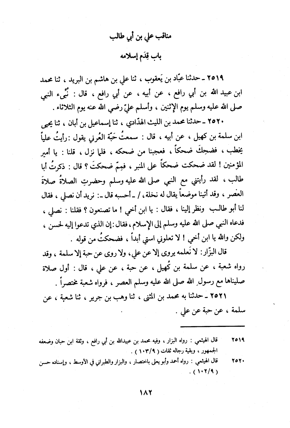 2520 - حَدَّثَنَا مُحَمَّدُ بْنُ اللَّيْثِ الْهَدَادِيُّ، ثنا إِسْمَاعِيلُ بْنُ أَبَانٍ، ثنا يَحْيَى بْنُ سَلَمَةَ بْنِ كُهَيْلٍ، عَنْ أَبِيهِ، قَالَ: سَمِعْتُ حَبَّةَ الْعُرَنِيَّ يَقُولُ: رَأَيْتُ عَلِيًّا يَخْطُبُ، فَضَحِكَ ضَاحِكًا، فَعَجِبْنَا مِنْ ضَحِكِهِ، فَلَمَّا نَزَلَ، قُلْنَا: يَا أَمِيرَ الْمُؤْمِنِينَ! لَقَدْ ضَحِكْتَ ضَحِكًا عَلَى الْمِنْبَرِ، فَمِمَّ ضَحِكْتَ؟ قَالَ: ذَكَرْتُ أَبَا طَالِبٍ، لَقَدْ رَأَيْتُنِي مَعَ النَّبِيِّ صَلَّى اللَّهُ عَلَيْهِ وَسَلَّمَ وَحَضَرَتِ الصَّلاةُ صَلاةُ الْعَصْرِ، وَقَدْ أَتَيْنَا مَوْضِعًا يُقَالُ لَهُ: نَخْلَةُ، - أَحْسِبُهُ قَالَ -: نُرِيدُ أَنْ نُصَلِّيَ، فَقَالَ لَنَا أَبُو طَالِبٍ وَنَظَرَ إِلَيْنَا، فَقَالَ: يَابْنَ أَخِي! مَا تَصْنَعُونَ؟ فَقُلْنَا: نُصَلِّي، فَدَعَاهُ النَّبِيُّ صَلَّى اللَّهُ عَلَيْهِ وَسَلَّمَ إِلَى الإِسْلامِ، فَقَالَ: إِنَّ الَّذِي تَدْعُو إِلَيْهِ لَحَسَنٌ، وَلَكِنْ وَاللَّهِ يَابْنَ أَخِي! لا تَعْلُونِي اسْتِي أَبَدًا، فَضَحِكْتُ مِنْ قَوْلِهِ.