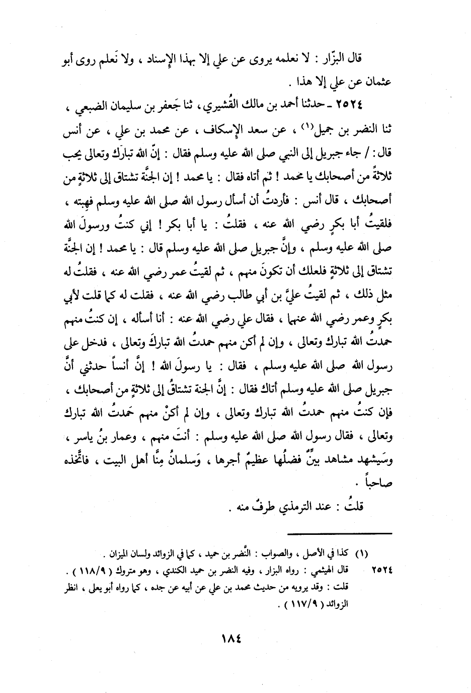 2524 - حَدَّثَنَا أَحْمَدُ بْنُ مَالِكٍ الْقُشَيْرِيُّ، ثنا جَعْفَرُ بْنُ سُلَيْمَانَ الضُّبَعِيُّ، ثنا النَّضْرُ بْنُ جَمِيلٍ، عَنْ سَعْدٍ الإِسْكَافِ، عَنْ مُحَمَّدِ بْنِ عَلِيٍّ، عَنْ أَنَسٍ قَالَ: جَاءَ جِبْرِيلُ إِلَى النَّبِيِّ صَلَّى اللَّهُ عَلَيْهِ وَسَلَّمَ فَقَالَ: إِنَّ اللَّهَ تَبَارَكَ وَتَعَالَى يُحِبُّ ثَلاثَةً مِنْ أَصْحَابِكَ يَا مُحَمَّدُ! ثُمَّ أَتَاهُ فَقَالَ: يَا مُحَمَّدُ! إِنَّ الْجَنَّةَ تَشْتَاقُ إِلَى ثَلاثَةٍ مِنْ أَصْحَابِكَ، قَالَ أَنَسٌ: فَأَرَدْتُ أَنْ أَسْأَلَ رَسُولَ اللَّهِ صَلَّى اللَّهُ عَلَيْهِ وَسَلَّمَ فَهِبْتُهُ، فَلَقِيتُ أَبَا بَكْرٍ رَضِيَ اللَّهُ عَنْهُ، فَقُلْتُ: يَا أَبَا بَكْرٍ! إِنِّي كُنْتُ وَرَسُولُ اللَّهِ صَلَّى اللَّهُ عَلَيْهِ وَسَلَّمَ، وَإِنَّ جِبْرِيلَ صَلَّى اللَّهُ عَلَيْهِ وَسَلَّمَ قَالَ: يَا مُحَمَّدُ! إِنَّ الْجَنَّةَ تَشْتَاقُ إِلَى ثَلاثَةٍ فَلَعَلَّكَ أَنْ تَكُونَ مِنْهُمْ، ثُمَّ لَقِيتُ عُمَرَ رَضِيَ اللَّهُ عَنْهُ، فَقُلْتُ لَهُ مِثْلَ ذَلِكَ، ثُمَّ لَقِيتُ عَلِيَّ بْنَ أَبِي طَالِبٍ رَضِيَ اللَّهُ عَنْهُ، فَقُلْتُ لَهُ كَمَا قُلْتُ لأَبِي بَكْرٍ وَعُمَرَ رَضِيَ اللَّهُ عَنْهُمَا، فَقَالَ عَلِيٌّ رَضِيَ اللَّهُ عَنْهُ: أَنَا أَسْأَلُهُ، إِنْ كُنْتُ مِنْهُمْ حَمِدْتُ اللَّهَ تَبَارَكَ وَتَعَالَى، وَإِنْ لَمْ أَكُنْ مِنْهُمْ حَمِدْتُ اللَّهَ تَبَارَكَ وَتَعَالَى، فَدَخَلَ عَلَى رَسُولِ اللَّهِ صَلَّى اللَّهُ عَلَيْهِ وَسَلَّمَ، فَقَالَ: يَا رَسُولَ اللَّهِ! إِنَّ أَنَسًا حَدَّثَنِي أَنَّ جِبْرِيلَ صَلَّى اللَّهُ عَلَيْهِ وَسَلَّمَ أَتَاكَ فَقَالَ: إِنَّ الْجَنَّةَ تَشْتَاقُ إِلَى ثَلاثَةٍ مِنْ أَصْحَابِكَ، فَإِنْ كُنْتُ مِنْهُمْ حَمِدْتُ اللَّهَ تَبَارَكَ وَتَعَالَى، وَإِنْ لَمْ أَكُنْ مِنْهُمْ حَمِدْتُ اللَّهَ تَبَارَكَ وَتَعَالَى، فَقَالَ رَسُولُ اللَّهِ صَلَّى اللَّهُ عَلَيْهِ وَسَلَّمَ: «أَنْتَ مِنْهُمْ، وَعَمَّارُ بْنُ يَاسِرٍ، وَسَيَشْهَدُ مَشَاهِدَ بَيِّنٌ فَضْلُهَا , عَظِيمٌ أَجْرُهَا، وَسَلْمَانُ مِنَّا أَهْلَ الْبَيْتِ، فَاتَّخَذَهُ صَاحِبًا» .