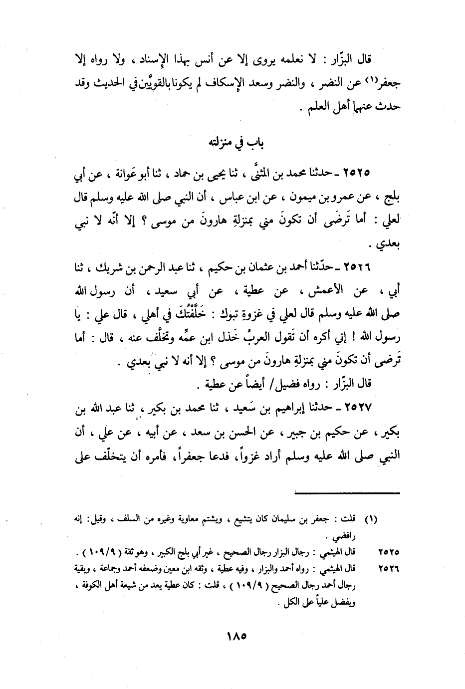 2525 - حَدَّثَنَا مُحَمَّدُ بْنُ الْمُثَنَّى، ثنا يَحْيَى بْنُ حَمَّادٍ، ثنا أَبُو عَوَانَةَ، عَنْ أَبِي بَلجٍ، عَنْ عَمْرِو بْنِ مَيْمُونٍ، عَنِ ابْنِ عَبَّاسٍ، أَنَّ النَّبِيَّ صَلَّى اللَّهُ عَلَيْهِ وَسَلَّمَ قَالَ لِعَلِيٍّ: «أَمَا تَرْضَى أَنْ تَكُونَ مِنِّي بِمَنْزِلَةِ هَارُونَ مِنْ مُوسَى؟ إِلا أَنَّهُ لا نَبِيَّ بَعْدِي» .