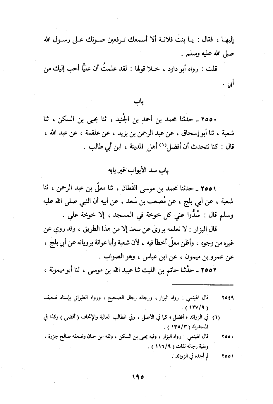 2551 - حَدَّثَنَا مُحَمَّدُ بْنُ مُوسَى الْقَطَّانُ، ثنا مُعَلَّى بْنُ عَبْدِ الرَّحْمَنِ، ثنا شُعْبَةُ، عَنْ أَبِي بَلْجٍ، عَنْ مُصْعَبِ بْنِ سَعْدٍ، عَنْ أَبِيهِ، أَنَّ النَّبِيَّ صَلَّى اللَّهُ عَلَيْهِ وَسَلَّمَ قَالَ: «سُدُّوا عَنِّي كُلَّ خَوْخَةٍ فِي الْمَسْجِدِ، إِلا خَوْخَةَ عَلِيٍّ» .