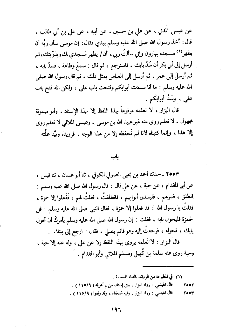 2553 - حَدَّثَنَا أَحْمَدُ بْنُ يَحْيَى الصُّوفِيُّ الْكُوفِيُّ، ثنا أَبُو غَسَّانَ، ثنا قَيْسٌ، عَنْ أَبِي الْمِقْدَامِ، عَنْ حَبَّةَ، عَنْ عَلِيٍّ قَالَ: قَالَ رَسُولُ اللَّهِ صَلَّى اللَّهُ عَلَيْهِ وَسَلَّمَ: «انْطَلِقَ، فَمُرْهُمْ، فَلْيَسُدُّوا أَبْوَابَهُمْ» فَانْطَلَقْتُ، فَقُلْتُ لَهُمْ، فَفَعَلُوا إِلا حَمْزَةَ، فَقُلْتُ: يَا رَسُولَ اللَّهِ: قَدْ فَعَلُوا إِلا حَمْزَةَ، فَقَالَ النَّبِيُّ صَلَّى اللَّهُ عَلَيْهِ وَسَلَّمَ: «قُلْ لِحَمْزَةَ فَلْيُحَوِّلْ بَابَهُ» فَقُلْتُ: إِنَّ رَسُولَ اللَّهِ صَلَّى اللَّهُ عَلَيْهِ وَسَلَّمَ يَأْمُرُكَ أَنْ تُحَوِّلَ بَابَكَ، فَحَوَّلَهُ، فَرَجَعْتُ إِلَيْهِ وَهُوَ قَائِمٌ يُصَلِّي، فَقَالَ: «ارْجِعْ إِلَى بَيْتِكَ» .