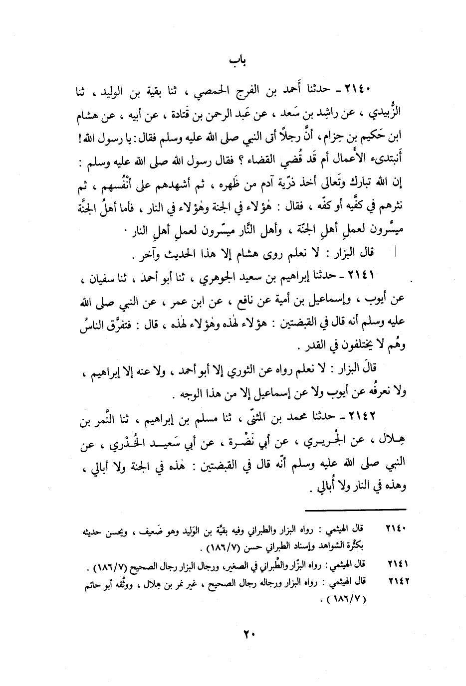 2141 - حَدَّثَنَا إِبْرَاهِيمُ بْنُ سَعِيدٍ الْجَوْهَرِيُّ، ثنا أَبُو أَحْمَدَ، ثنا سُفْيَانُ، عَنْ أَيُّوبَ، وَإِسْمَاعِيلَ بْنِ أُمَيَّةَ , عَنْ نَافِعٍ، عَنِ ابْنِ عُمَرَ، عَنِ النَّبِيِّ صَلَّى اللَّهُ عَلَيْهِ وَسَلَّمَ أَنَّهُ قَالَ فِي الْقَبْضَتَيْنِ: هَؤُلاءِ لِهَذِهِ وَهَؤُلاءِ لِهَذِهِ، قَالَ: فَتَفَرَّقَ النَّاسُ وَهُمْ لا يَخْتَلِفُونَ فِي الْقَدرِ.