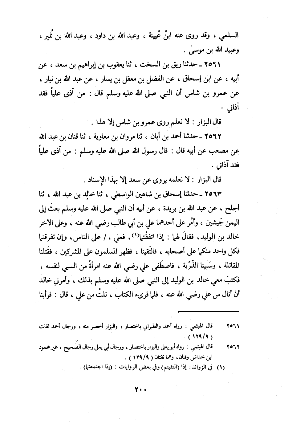 2563 - حَدَّثَنَا إِسْحَاقُ بْنُ شَاهِينَ الْوَاسِطِيُّ، ثنا خَالِدُ بْنُ عَبْدِ اللَّهِ، ثنا أَجْلَحُ، عَنْ عَبْدِ اللَّهِ بْنِ بُرَيْدَةَ، عَنْ أَبِيهِ أَنَّ النَّبِيَّ صَلَّى اللَّهُ عَلَيْهِ وَسَلَّمَ بَعَثَ إِلَى الْيَمَنِ جَيْشَيْنِ، وَأَمَّرَ عَلَى أَحَدِهِمَا عَلِيَّ بْنَ أَبِي طَالِبٍ رَضِيَ اللَّهُ عَنْهُ، وَعَلَى الآخَرِ خَالِدَ بْنَ الْوَلِيدِ، فَقَالَ لَهُمَا: «إِذَا اتَّفَقْتُمَا، فَعَلِيٌّ، عَلَى النَّاسِ، وَإِنْ تَفَرَّقْتُمَا فَكُلُّ وَاحِدٍ مِنْكُمَا عَلَى أَصْحَابِهِ» ، فَالْتَقَيْنَا، فَظَهَرَ الْمُسْلِمُونَ عَلَى الْمُشْرِكِينَ، فَقَتَلْنَا الْمُقَاتِلَةَ، وَسَبَيْنَا الذَّرِيَّةَ، فَاصْطَفَى عَلِيٌّ رَضِيَ اللَّهُ عَنْهُ امْرَأَةً مِنَ السَّبْيِ لِنَفْسِهِ، فَكَتَبَ مَعِي خَالِدُ بْنُ الْوَلِيدِ إِلَى النَّبِيِّ صَلَّى اللَّهُ عَلَيْهِ وَسَلَّمَ بِذَلِكَ، وَأَمَرَنِي خَالِدٌ أَنْ أَنَالَ مِنْ عَلِيٍّ رَضِيَ اللَّهُ عَنْهُ، فَلَمَّا قُرِئَ الْكِتَابُ، نِلْتُ مِنْ عَلِيٍّ، قَالَ: فَرَأَيْنَا