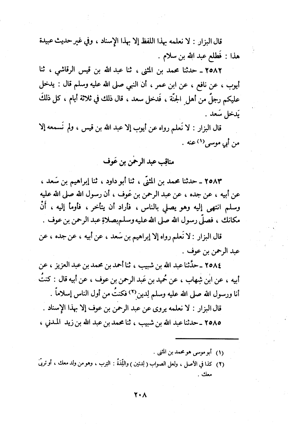 قَالَ الْبَزَّارُ: لا نَعْلَمُ رَوَاهُ إِلا إِبْرَاهِيمُ بْنُ سَعْدٍ، عَنْ أَبِيهِ، عَنْ جَدِّهِ، عَنْ عَبْدِ الرَّحْمَنِ بْنِ عَوْفٍ.