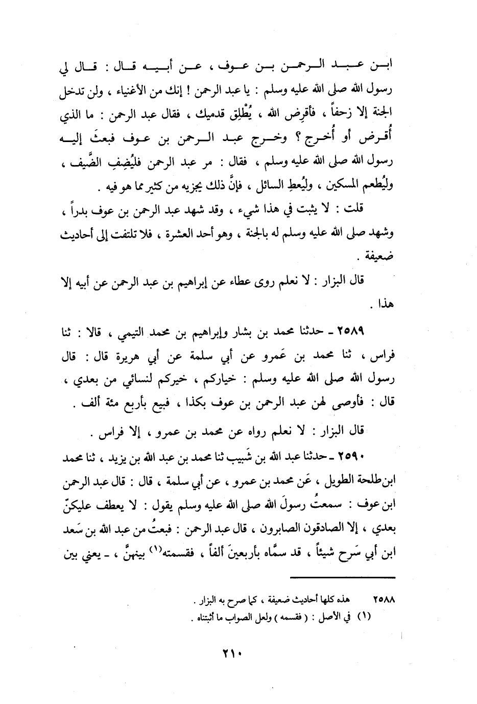 2590 - حَدَّثَنَا عَبْدُ اللَّهِ بْنُ شَبِيبٍ , ثنا مُحَمَّدُ بْنُ عَبْدِ اللَّهِ بْنِ زَيْدٍ، ثنا مُحَمَّدُ بْنُ طَلْحَةَ الطَّوِيلُ، عَنْ مُحَمَّدِ بْنِ عَمْرٍو، عَنْ أَبِي سَلَمَةَ، قَالَ: قَالَ عَبْدُ الرَّحْمَنِ بْنُ عَوْفٍ: سَمِعْتُ رَسُولَ اللَّهِ صَلَّى اللَّهُ عَلَيْهِ وَسَلَّمَ يَقُولُ: «لا يَعْطِفُ عَلَيْكُنَّ بَعْدِي، إِلا الصَّادِقُونَ الصَّابِرُونَ» قَالَ عَبْدُ الرَّحْمَنِ: فَبِعْتُ مِنْ عَبْدِ اللَّهِ بْنِ سَعْدِ بْنِ أَبِي سَرْحٍ شَيْئًا، قَدْ سَمَّاهُ بِأَرْبَعِينَ أَلْفًا، فَقَسَّمْتُهُ بَيْنَهُنَّ، - يَعْنِي: بَيْنَ