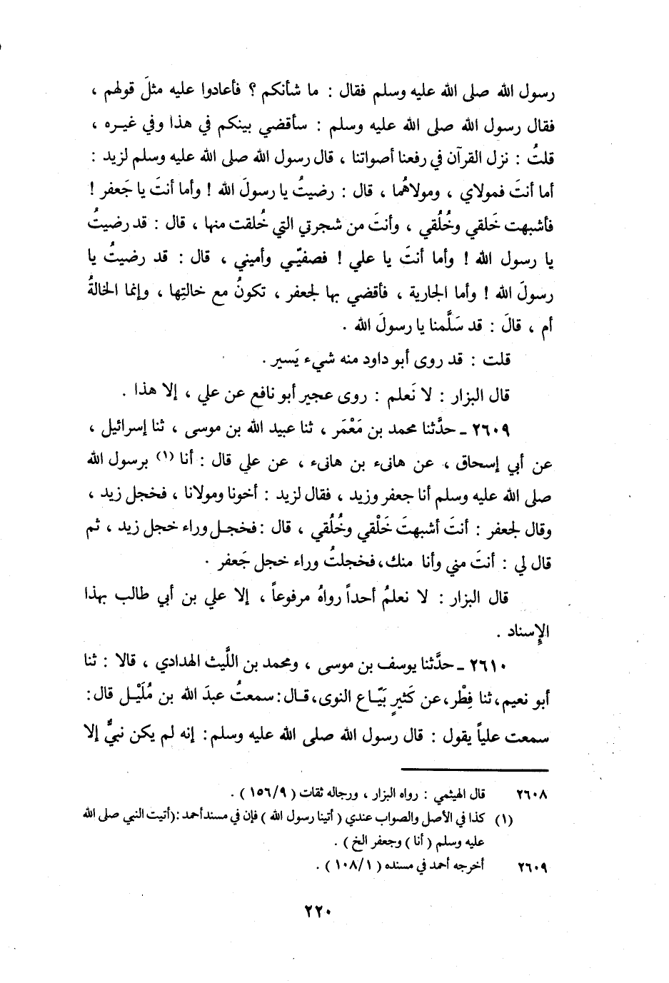 2609 - حَدَّثَنَا مُحَمَّدُ بْنُ مَعْمَرٍ، ثنا عُبَيْدُ اللَّهِ بْنُ مُوسَى، ثنا إِسْرَائِيلُ، عَنْ أَبِي إِسْحَاقَ، عَنْ هَانِئِ بْنِ هَانِئٍ، عَنْ عَلِيٍّ قَالَ: أَتَيْنَا رَسُولَ اللَّهِ صَلَّى اللَّهُ عَلَيْهِ وَسَلَّمَ أنا جَعْفَرٌ وَزَيْدٌ، فَقَالَ لِزَيْدٍ: «أَخُونَا وَمَوْلانَا» فَخَجِلَ زَيْدٌ، وَقَالَ لِجَعْفَرٍ: «أَنْتَ أَشْبَهْتَ خَلْقِي وَخُلُقِي» قَالَ: فَخَجِلَ وَرَاءَ خَجَلِ زَيْدٍ، ثُمَّ قَالَ لِي: «أَنْتَ مِنِّي وَأَنَا مِنْكَ» فَخَجِلْتُ وَرَاءَ خَجَلِ جَعْفَرٍ.