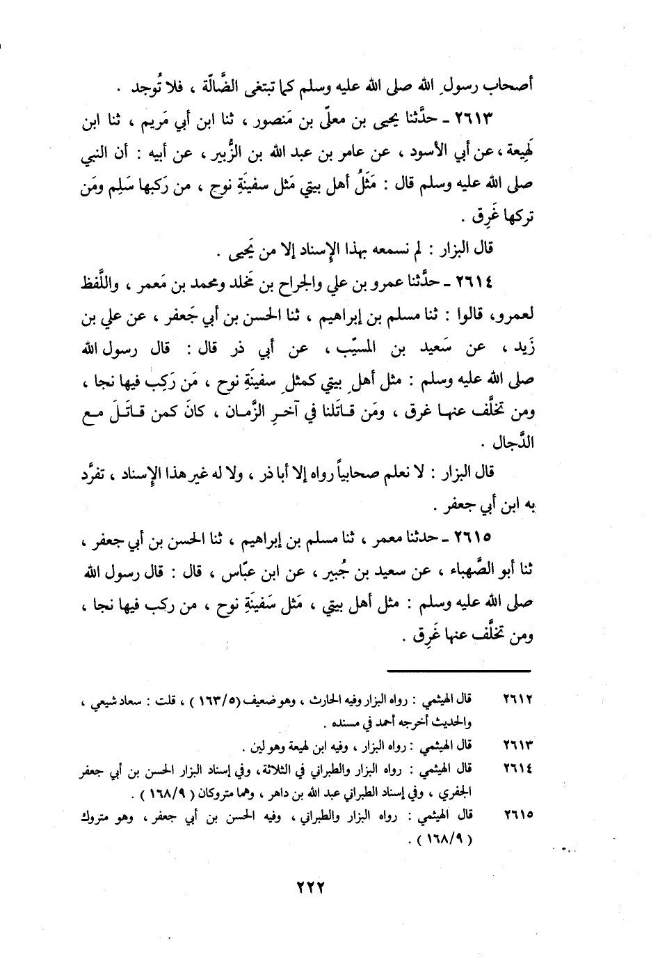 2613 - حَدَّثَنَا يَحْيَى بْنُ مُعَلَّى بْنِ مَنْصُورٍ، ثنا ابْنُ أَبِي مَرْيَمَ، ثنا ابْنُ لَهِيعَةَ، عَنْ أَبِي الأَسْوَدِ، عَنْ عَامِرِ بْنِ عَبْدِ اللَّهِ بْنِ الزُّبَيْرِ، عَنْ أَبِيهِ: أَنَّ النَّبِيَّ صَلَّى اللَّهُ عَلَيْهِ وَسَلَّمَ قَالَ: «مَثَلُ أَهْلِ بَيْتِي مَثَلُ سَفِينَةِ نُوحٍ، مَنْ رَكِبَهَا سَلِمَ وَمَنْ تَرَكَهَا غَرِقَ» .