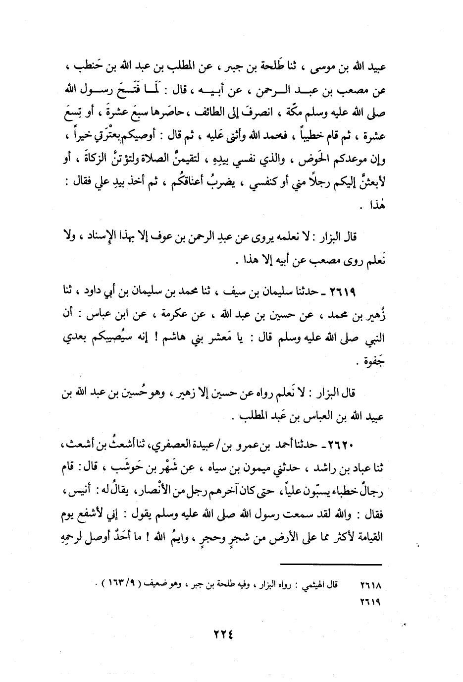 عُبَيْدُ اللَّهِ بْنُ مُوسَى، ثنا طَلْحَةُ بْنُ جُبْيَرٍ، عَنِ الْمُطَّلِبِ بْنِ عَبْدِ اللَّهِ بْنِ حَنْطَبٍ، عَنْ مُصْعَبِ بْنِ عَبْدِ الرَّحْمَنِ، عَنْ أَبِيهِ، قَالَ: لَمَّا فَتَحَ رَسُولُ اللَّهِ صَلَّى اللَّهُ عَلَيْهِ وَسَلَّمَ مَكَّةَ، انْصَرَفَ إِلَى الطَّائِفِ، حَاصَرَهَا سَبْعَ عَشْرَةَ، أَوْ تِسْعَ عَشْرَةَ، ثُمَّ قَامَ خَطِيبًا، فَحَمِدَ اللَّهَ وَأَثْنَى عَلَيْهِ، ثُمَّ قَالَ: «أُوصِيكُمْ بِعِتْرَتِي خَيْرًا، وَإِنَّ مَوْعِدُكُمُ الْحَوْضَ، وَالَّذِي نَفْسِي بِيَدِهِ، لَتُقِيمَنَّ الصَّلاةَ وَلَتُؤتُنَّ الزَّكَاةَ، أَوْ لأَبْعَثَنَّ إِلَيْكُمْ رَجُلًا مِنِّي أَوْ كَنَفْسِي، يَضْرِبُ أَعْنَاقَكُمْ» ثُمَّ أَخَذَ بِيَدِ عَلِيٍّ فَقَالَ: «هَذَا» .