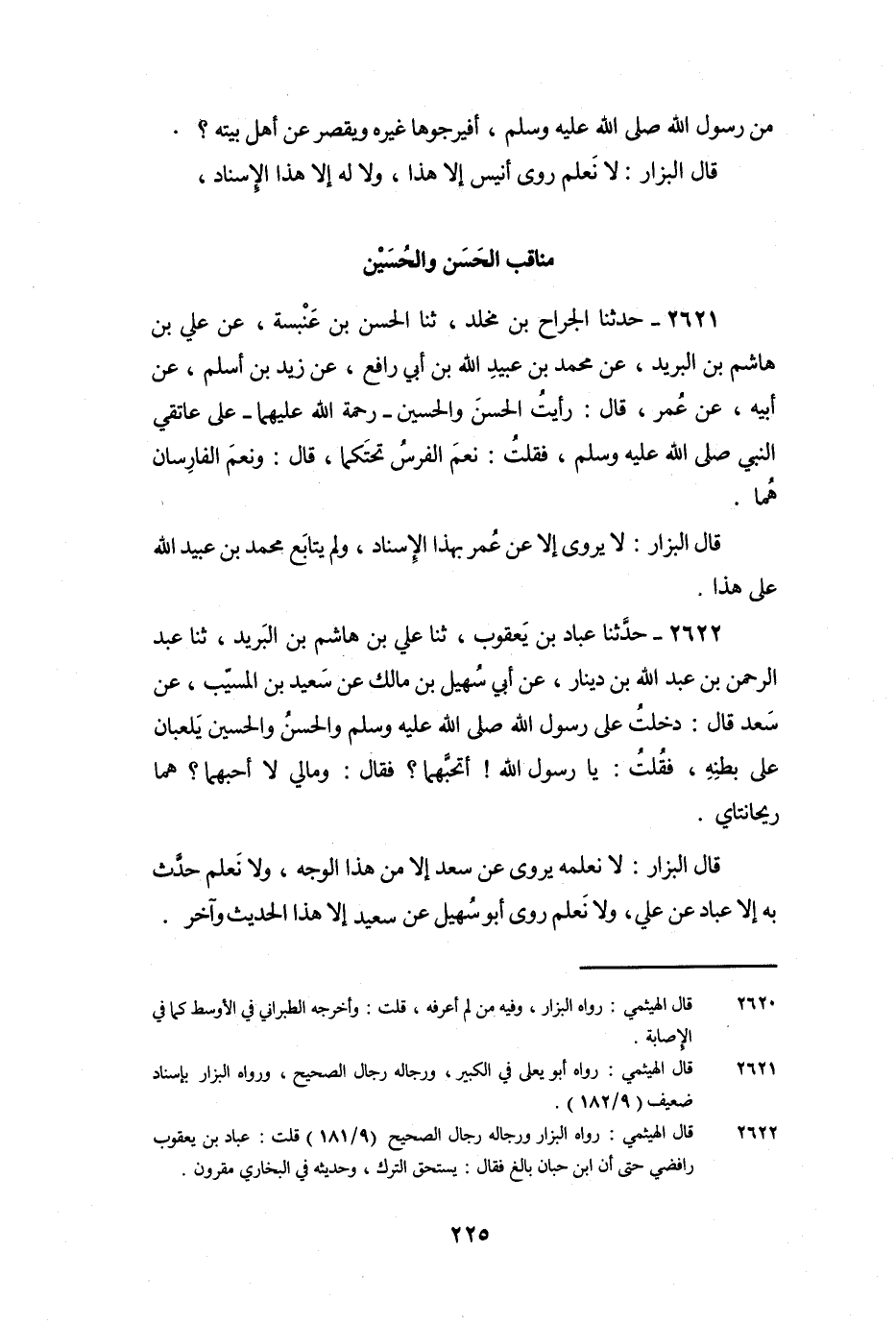 2622 - حَدَّثَنَا عَبَّادُ بْنُ يَعْقُوبَ، ثنا عَلِيُّ بْنُ هَاشِمُ بْنُ الْبَرِيدِ، ثنا عَبْدُ الرَّحْمَنِ بْنُ عَبْدِ اللَّهِ بْنِ دِينَارٍ، عَنْ أَبِي سُهَيْلِ بْنِ مَالِكٍ , عَنْ سَعِيدِ بْنِ الْمُسَيِّبِ، عَنْ سَعْدٍ قَالَ: دَخَلْتُ عَلَى رَسُولِ اللَّهِ صَلَّى اللَّهُ عَلَيْهِ وَسَلَّمَ وَالْحَسَنُ وَالْحُسَيْنُ يَلْعَبَانِ عَلَى بَطْنِهِ، فَقُلْتُ: يَا رَسُولَ اللَّهِ! أَتُحِبُّهُمَا؟ فَقَالَ: «وَمَالِي لا أُحِبُّهُمَا؟ هُمَا رَيْحَانَتَايَ» .