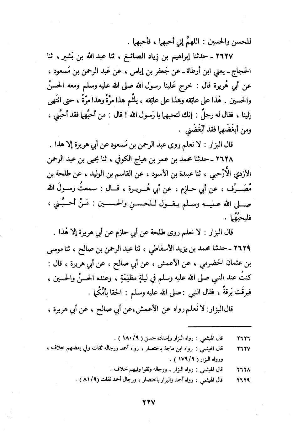 2628 - حَدَّثَنَا مُحَمَّدُ بْنُ عُمَرَ بْنِ هَيَّاجٍ الْكُوفِيُّ، ثنا يَحْيَى بْنُ عَبْدِ الرَّحْمَنِ الأَزْدِيُّ الأَرْحَبِيُّ، ثنا عُبَيْدَةُ بْنُ الأَسْوَدِ، عَنِ الْقَاسِمِ بْنِ الْوَلِيدِ، عَنْ طَلْحَةَ بْنِ مُصَرِّفٍ، عَنْ أَبِي حَازِمٍ، عَنْ أَبِي هُرَيْرَةَ، قَالَ: سَمِعْتُ رَسُولَ اللَّهِ صَلَّى اللَّهُ عَلَيْهِ وَسَلَّمَ يَقُولُ لِلْحَسَنِ وَالْحُسَيْنِ: «مَنْ أَحَبَّنِي، فَلْيُحِبَّهُمَا» .