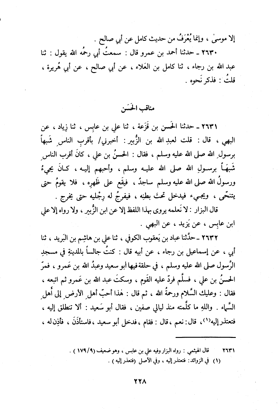 2631 - حَدَّثَنَا الْحَسَنُ بْنُ قَزَعَةَ: ثنا عَلِيُّ بْنُ عَابِسٍ، ثنا يَزِيدُ بْنُ أَبِي زِيَادٍ، عَنِ الْبَهِيِّ، قَالَ: قُلْتُ لِعَبْدِ اللَّهِ بْنِ الزُّبَيْرِ: أَخْبِرْنِي بِأَقْرَبَ النَّاسِ شَبَهًا بِرَسُولِ اللَّهِ صَلَّى اللَّهُ عَلَيْهِ وَسَلَّمَ، فَقَالَ: الْحَسَنُ بْنُ عَلِيٍّ، كَانَ أَقْرَبَ النَّاسِ شَبَهًا بِرَسُولِ اللَّهِ صَلَّى اللَّهُ عَلَيْهِ وَسَلَّمَ، وَأَحَبَّهُمْ إِلَيْهِ، كَانَ يَجِيءُ وَرَسُولُ اللَّهِ صَلَّى اللَّهُ عَلَيْهِ وَسَلَّمَ سَاجِدٌ، فَيَقَعُ عَلَى ظَهْرِهِ، فَلا يَقُومُ حَتَّى يَتَنَحَّى، وَيَجِيءُ فَيَدْخُلُ تَحْتَ بَطْنِهِ، فَيُفَرِّجُ لَهُ رِجْلَيْهِ حَتَّى يَخْرُجَ.