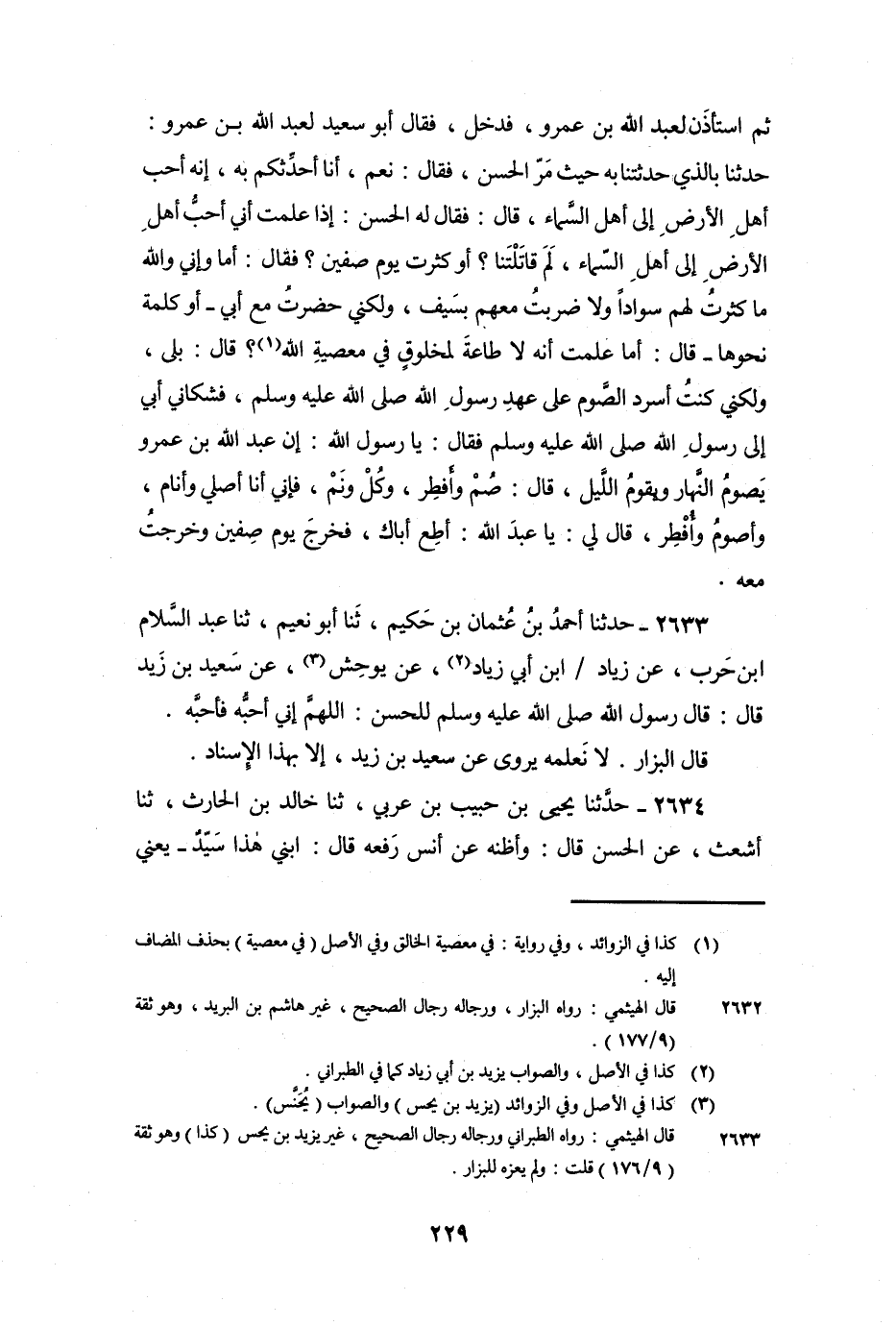 2633 - حَدَّثَنَا أَحْمَدُ بْنُ عُثْمَانَ بْنِ حَكِيمٍ، ثنا أَبُو نُعَيْمٍ، ثنا عَبْدُ السَّلامِ بْنُ حَرْبٍ، عَنْ يَزِيدَ بْنِ أَبِي زِيَادٍ، عَنْ يَزِيدَ بْنِ يُحَنَّسَ، عَنْ سَعِيدِ بْنِ زَيْدٍ قَالَ: قَالَ رَسُولُ اللَّهِ صَلَّى اللَّهُ عَلَيْهِ وَسَلَّمَ لِلْحَسَنِ: «اللَّهُمَّ إِنِّي أُحِبُّهُ فَأَحِبَّهُ» .