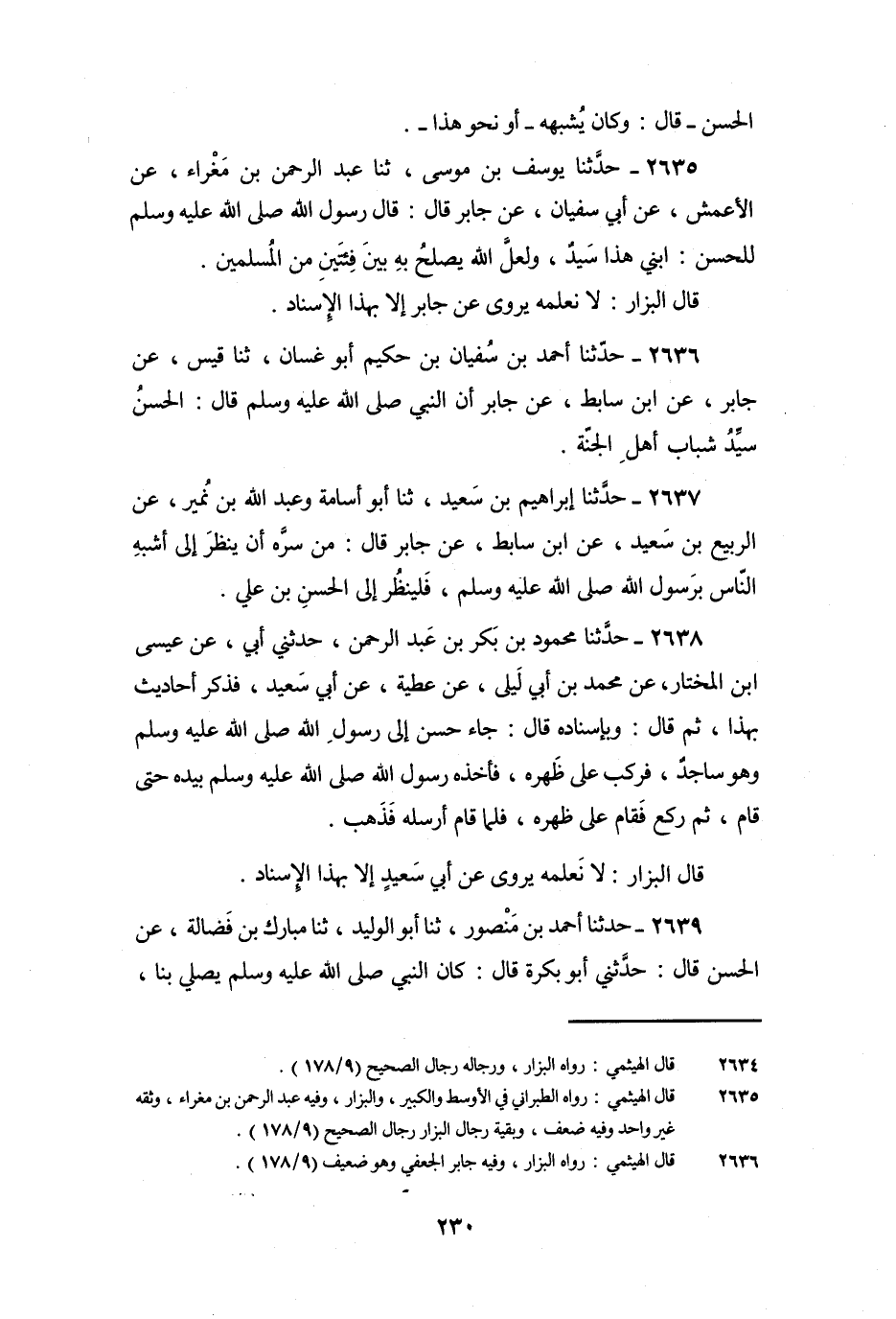 2638 - حَدَّثَنَا مَحْمُودُ بْنُ بَكْرِ بْنِ عَبْدِ الرَّحْمَنِ، حَدَّثَنِي أَبِي، عَنْ عِيسَى بْنِ الْمُخْتَارِ، عَنْ مُحَمَّدِ بْنِ أَبِي لَيْلَى، عَنْ عَطِيَّةَ، عَنْ أَبِي سَعِيدٍ، فَذَكَرَ أَحَادِيثَ بِهَذَا، ثُمَّ قَالَ: وَبِإِسْنَادِهِ قَالَ: جَاءَ حَسَنٌ إِلَى رَسُولِ اللَّهِ صَلَّى اللَّهُ عَلَيْهِ وَسَلَّمَ وَهُوَ سَاجِدٌ، فَرَكِبَ عَلَى ظَهْرِهِ , فَأَخَذَهُ رَسُولُ اللَّهِ صَلَّى اللَّهُ عَلَيْهِ وَسَلَّمَ بِيَدِهِ حَتَّى قَامَ، ثُمَّ رَكَعَ فَقَامَ عَلَى ظَهْرِهِ، فَلَمَّا قَامَ أَرْسَلَهُ فَذَهَبَ.